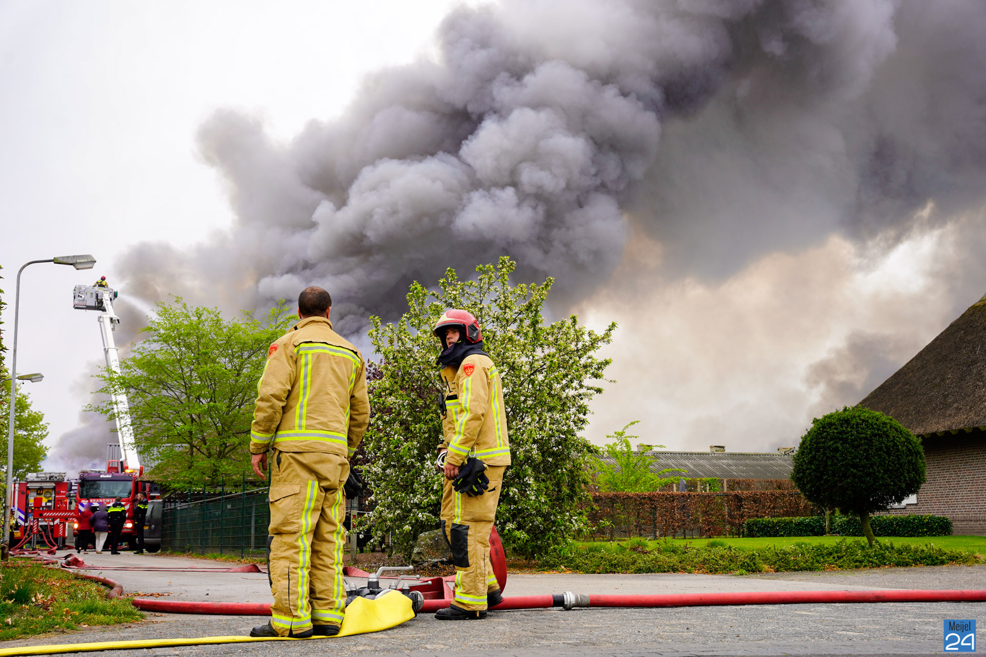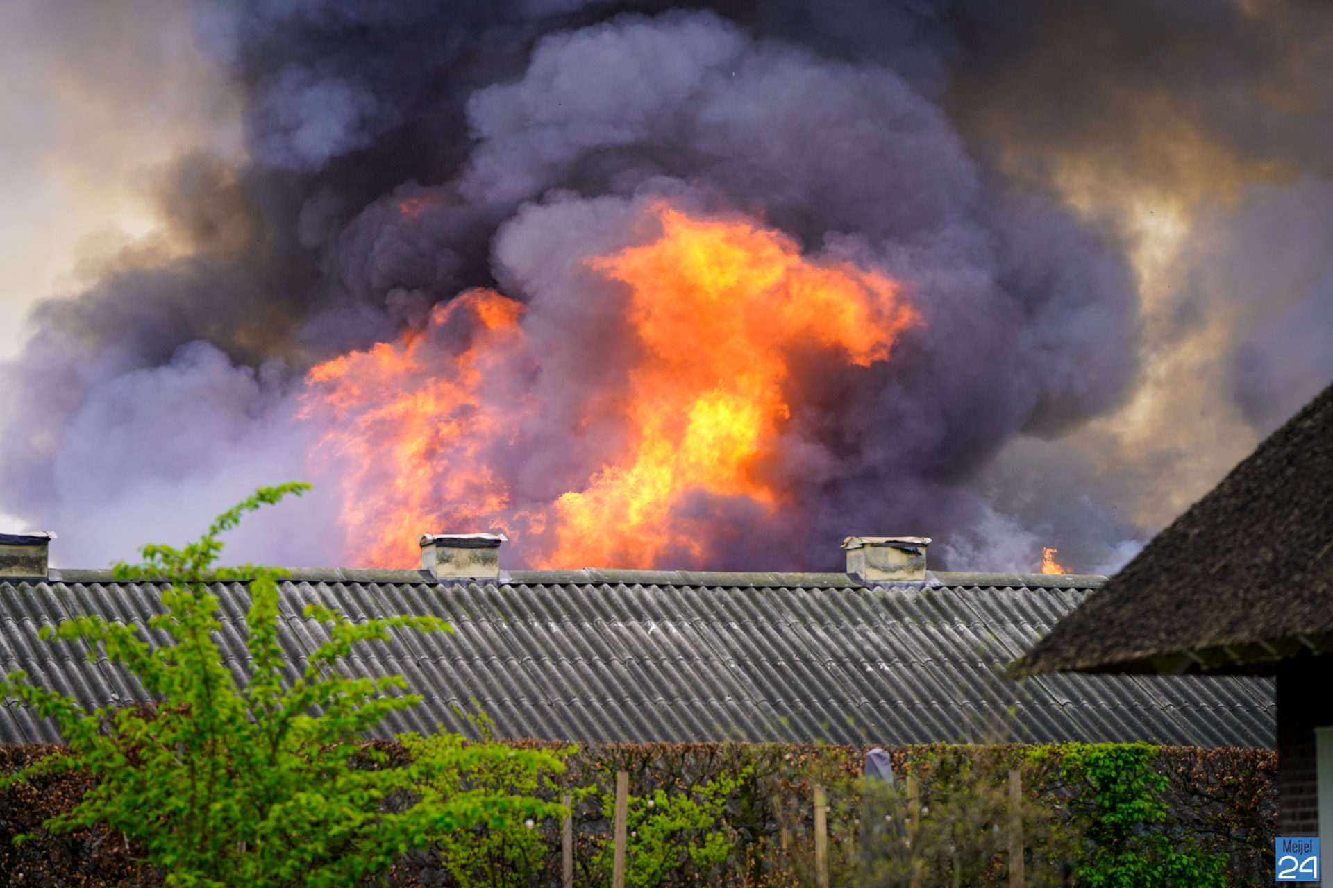 In de wijde omgeving is een donkere rookwolk te zien die boven het bedrijf hangt. De vlammen slaan uit het dak van twee kippenstallen. Duizenden kippen zijn omgekomen.