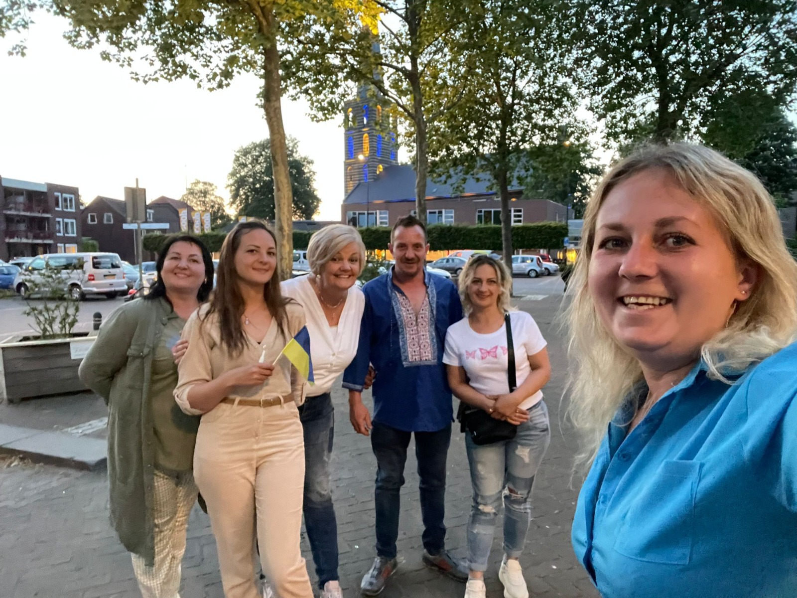 Met het Songfestival op een groot scherm op de achtergrond én met de kerktoren in het licht van de kleuren van de Oekraïense vlag, was het een gezellige avond.