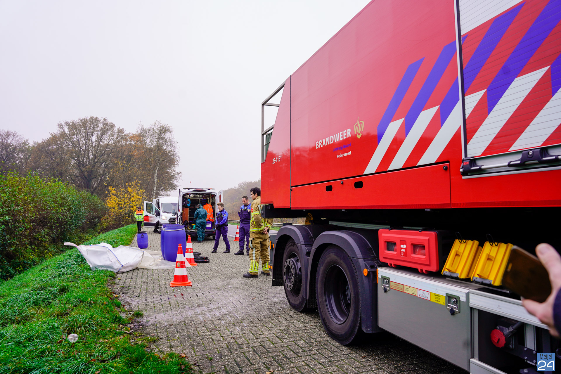 De brandweer kwam ter plaatse om met het waterkanon de berm nat te maken en de vloeistof te verdunnen, omdat een van de vaten heeft gelekt. Strukton zal uiteindelijk de vaten gaan ruimen. Handhaving houdt toezicht.