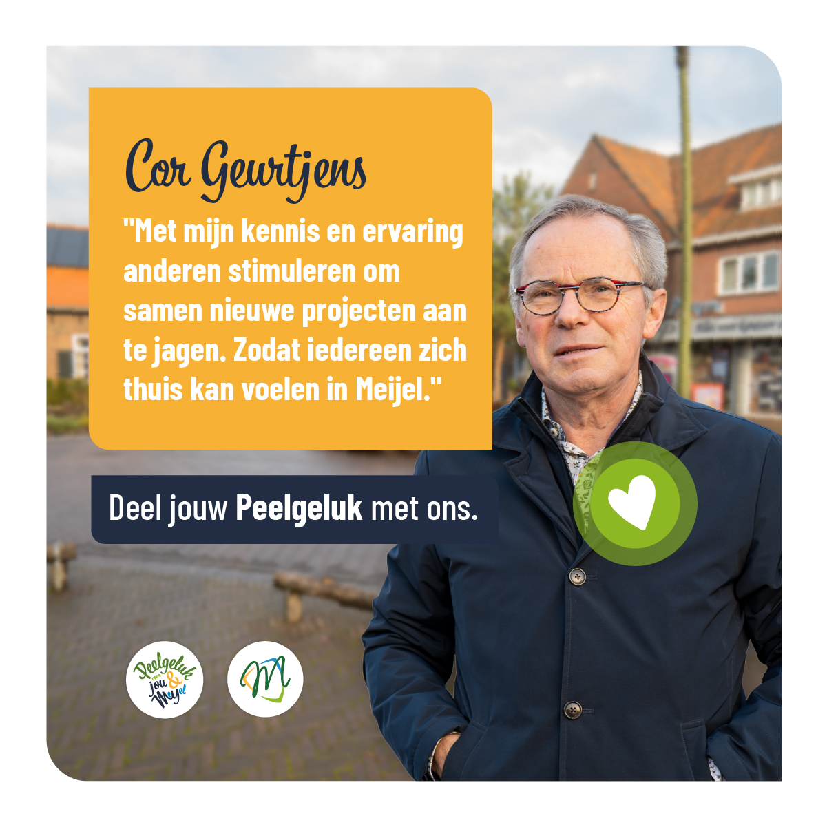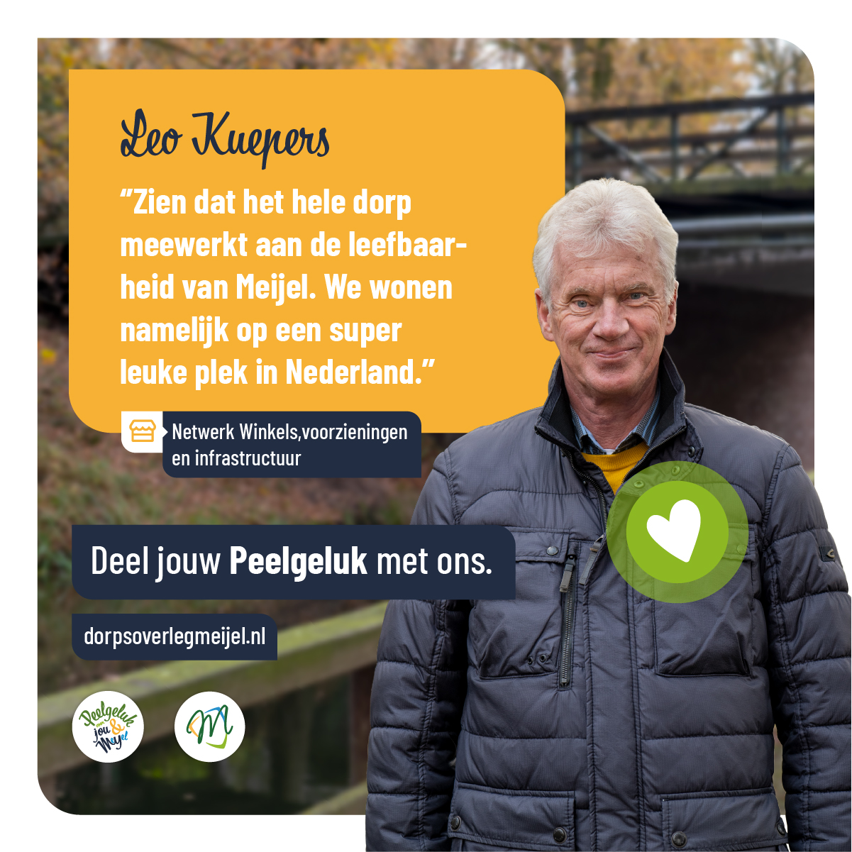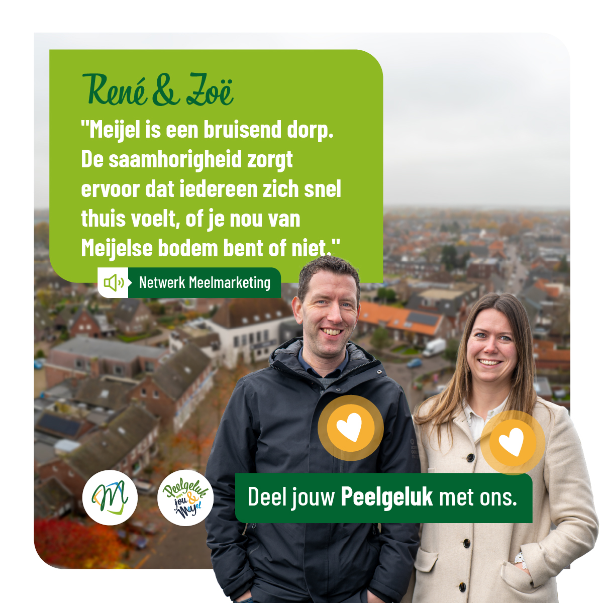 Er gebeurt veel in Meijel om het dorp leefbaar te maken en te houden. Daarom is het goed om hier bij stil te staan. Iedereen kan op zijn of haar manier hieraan bijdragen, zodat we ook in de toekomst op een fijne plek kunnen wonen waar kinderen naar school kunnen gaan, je een boodschap kunt doen of lekker kunt uiteten. Een plek waar we kunnen sporten, recreëren, bezig kunnen zijn met de toekomst, maar ook de Meijelse historie en het dialect behouden. Een plek waar jij je veilig voelt met betrokken dorpsgenoten om je heen.