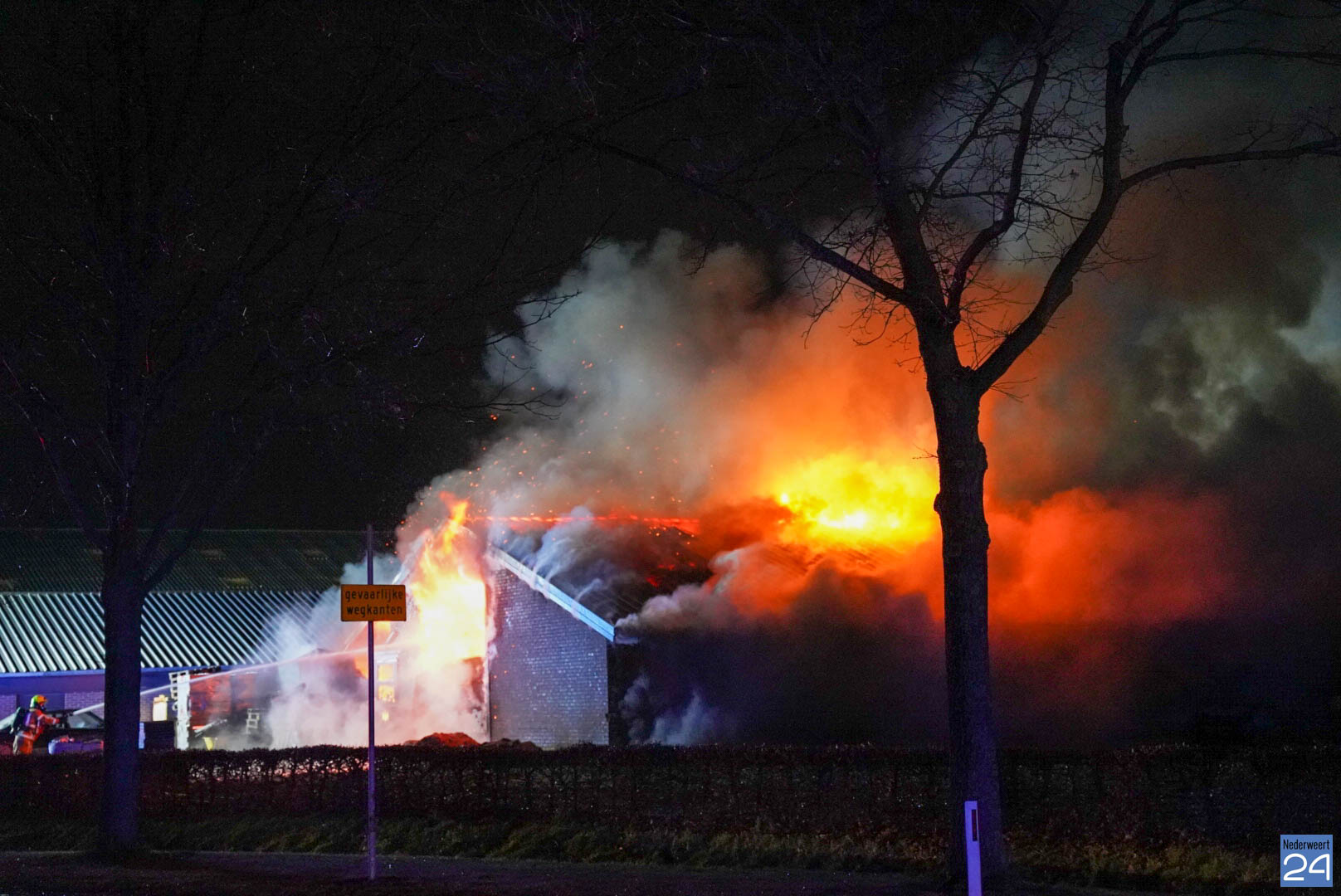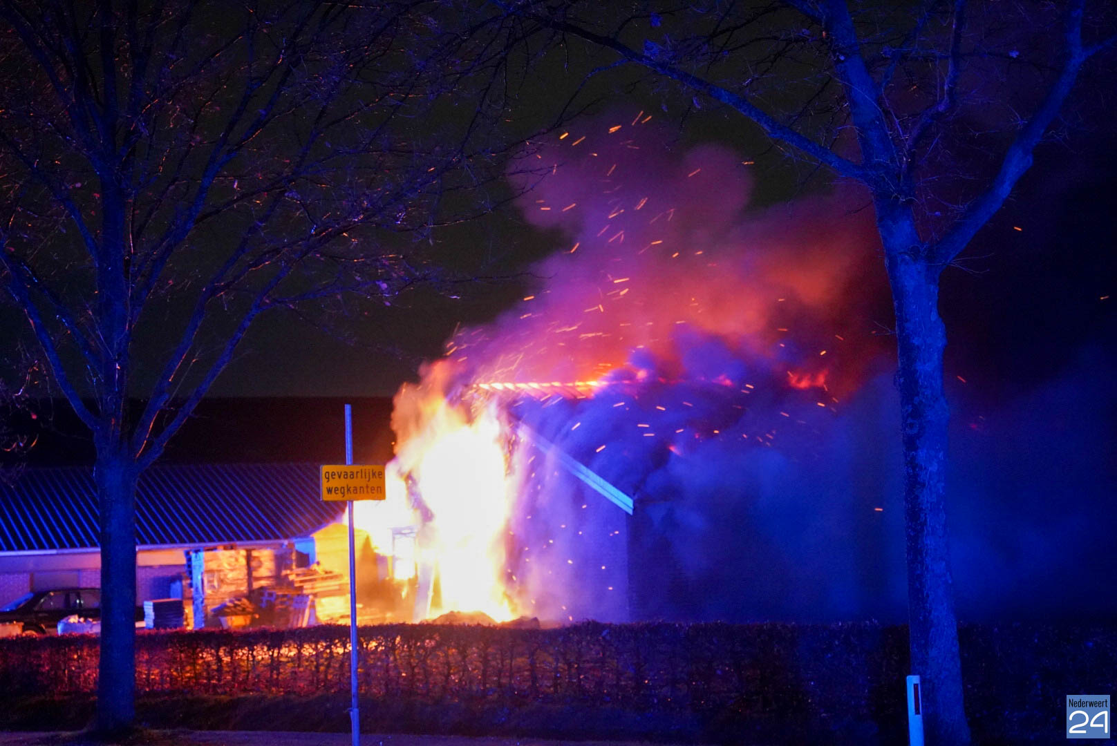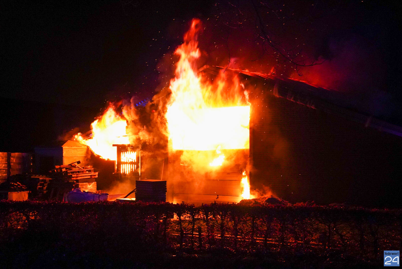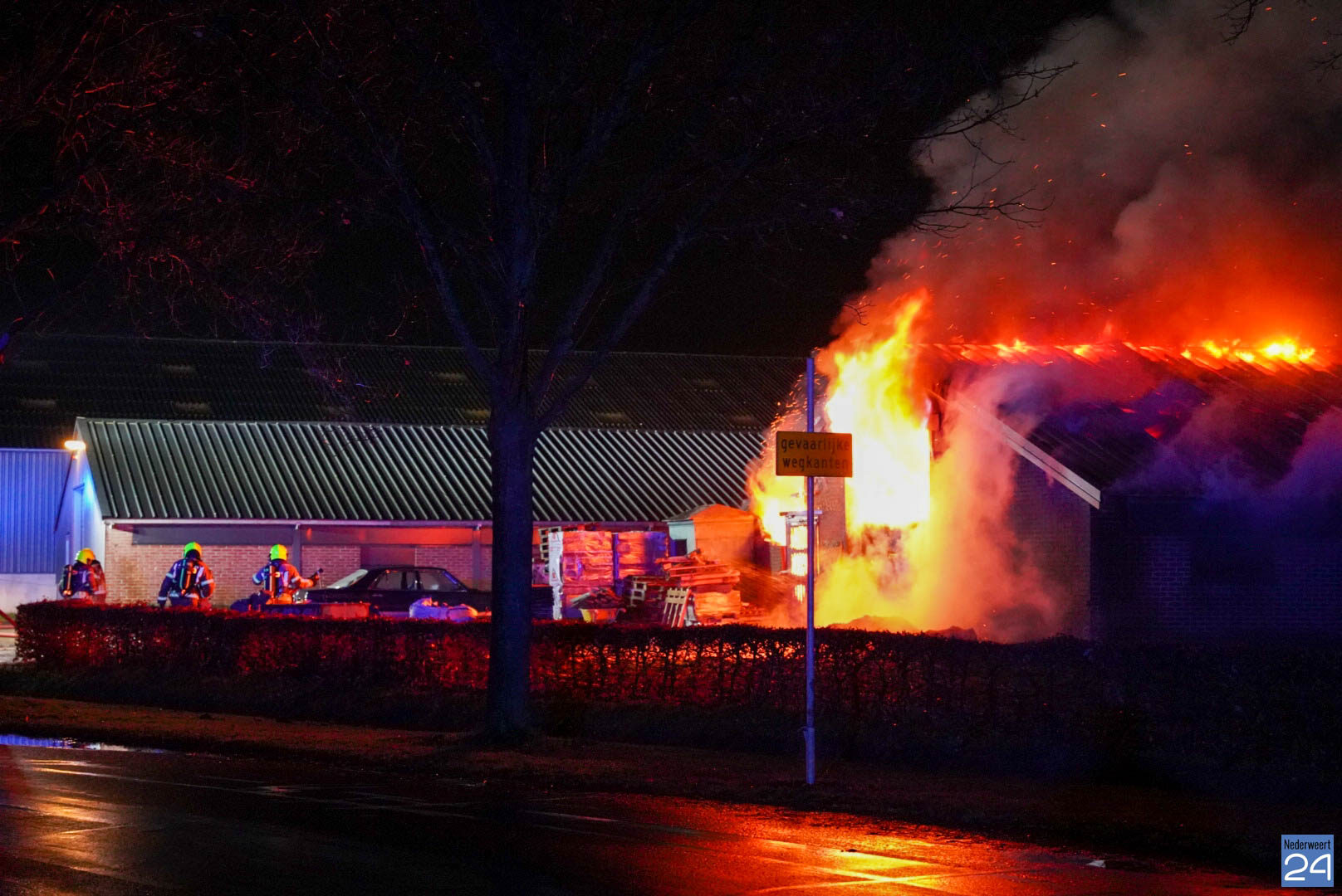 De brandweer zet alles in om overslag naar naastgelegen schuren te voorkomen.