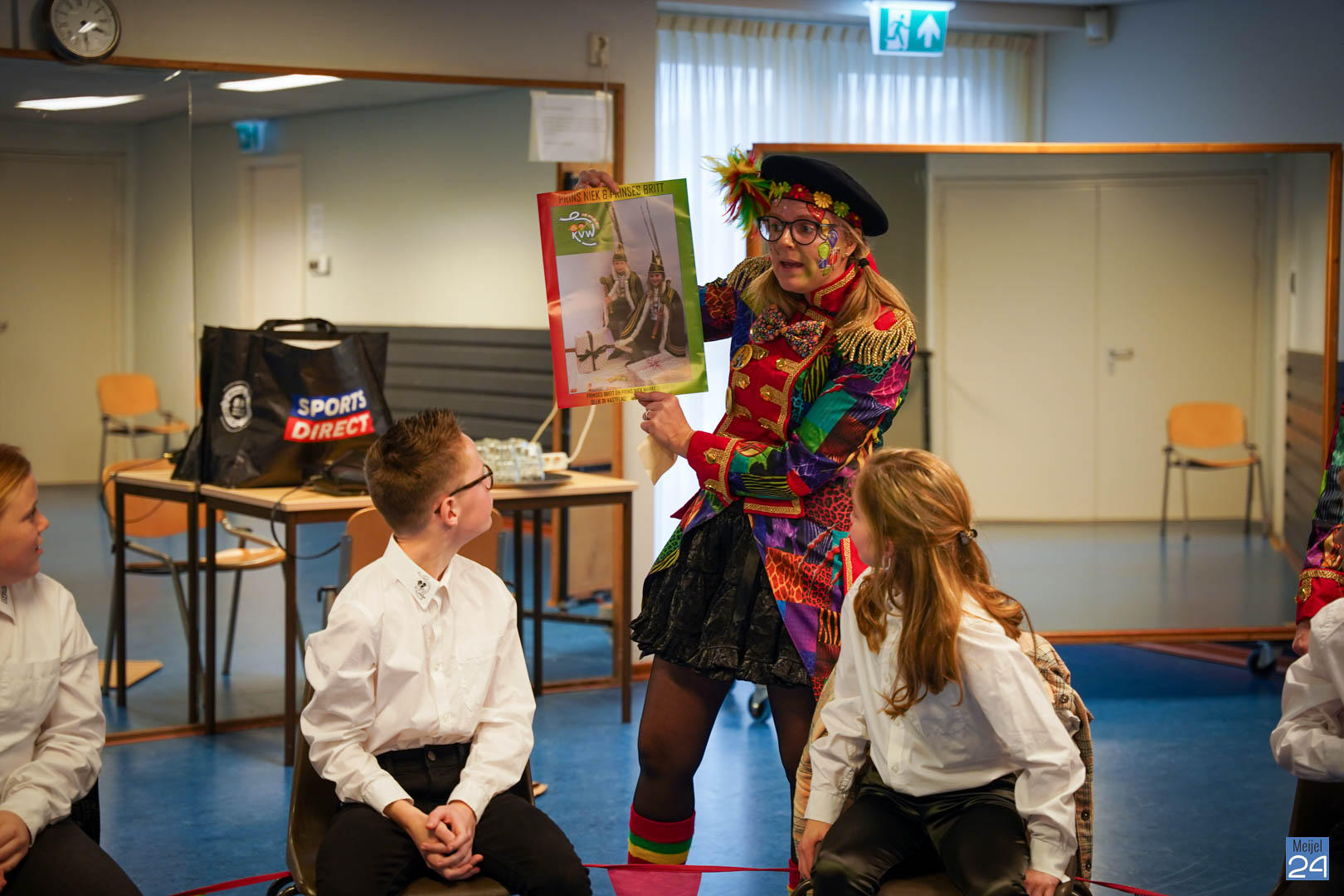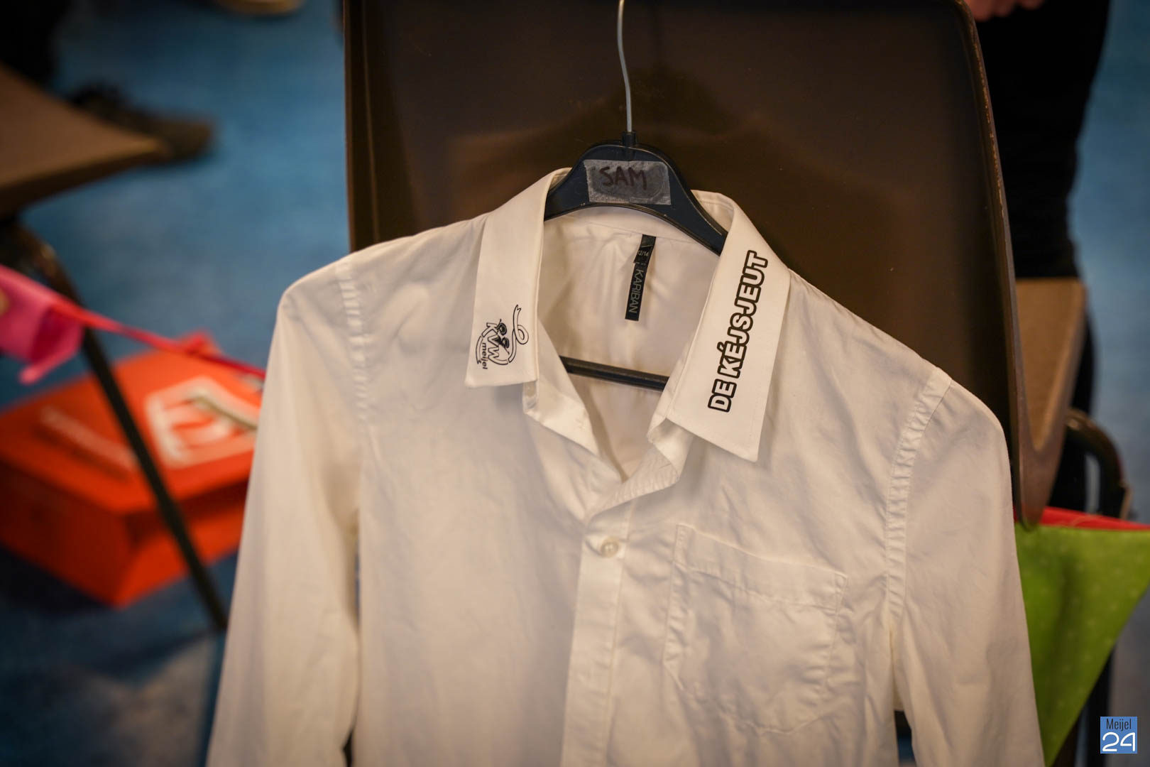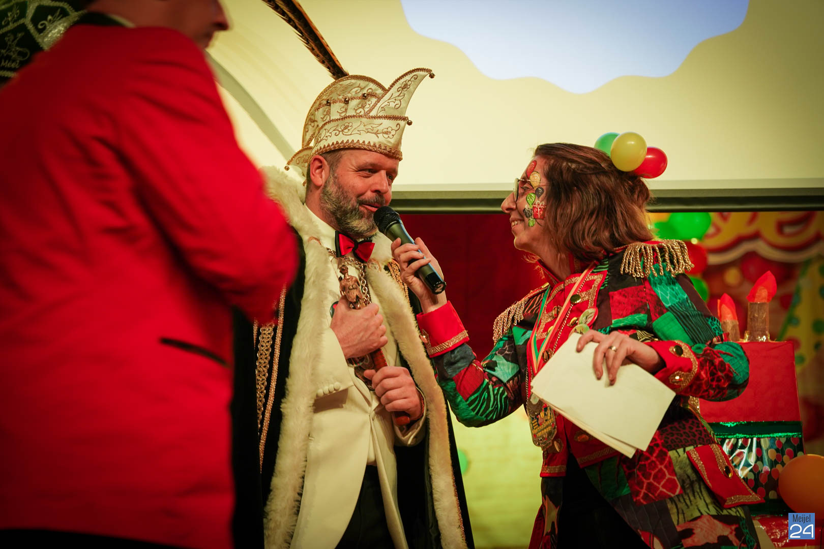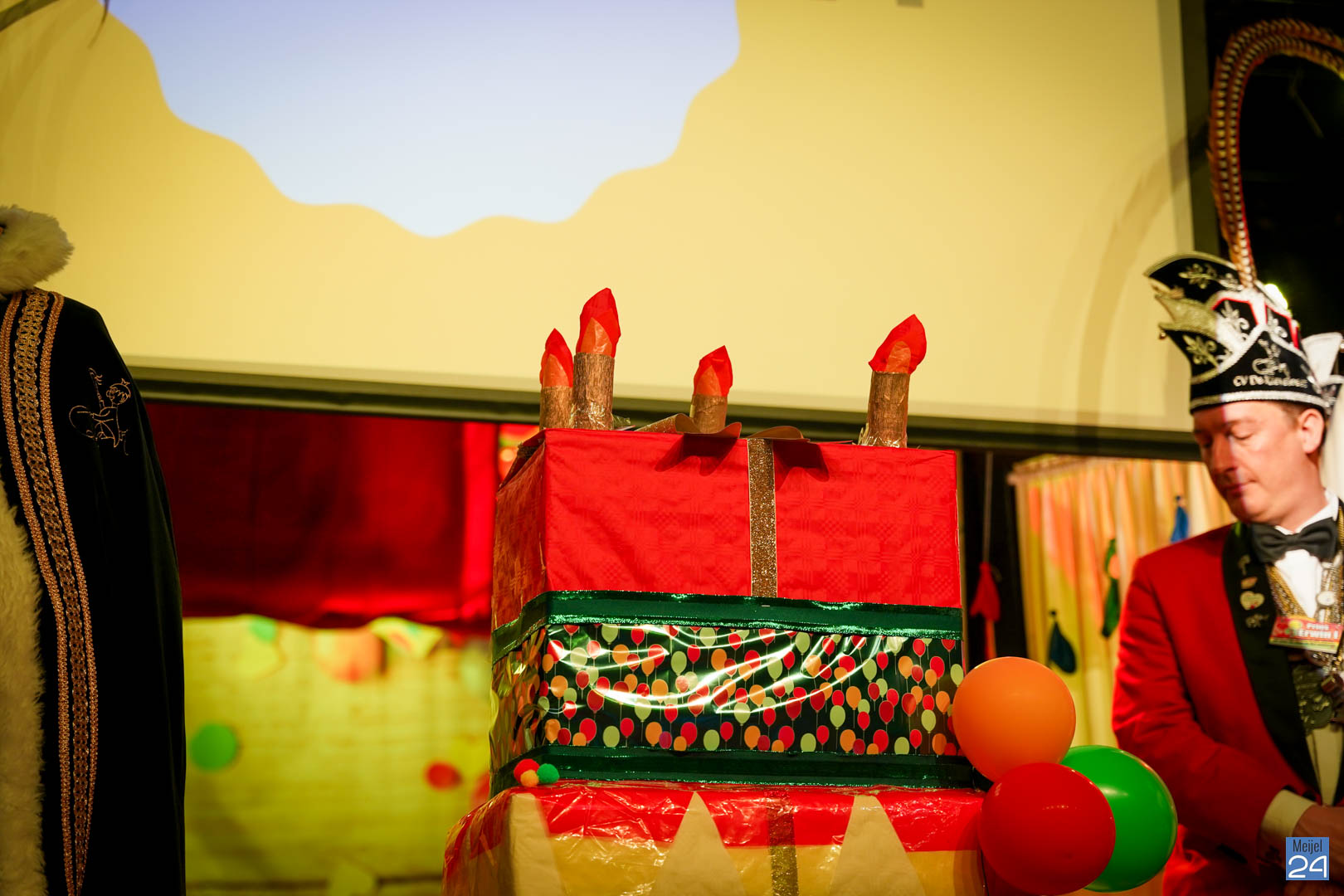 Wat een leuke en enthousiaste groep was hier tevoorschijn gekomen. Dat beloofd al heel wat. Maar… er mistte nog ‘de kers op de taart’: de nieuwe prins en prinses van de Kéjsjeut. Het werd stil in de zaal. De spanning was voelbaar. Maar de spanning zou zeker heel groot zijn bij de prins en prinses zelf. Nu kwam de grote taart in beeld die op het podium stond. Hieruit zouden ze komen. Na een introductie en wat kleine hints werd het duidelijk:
