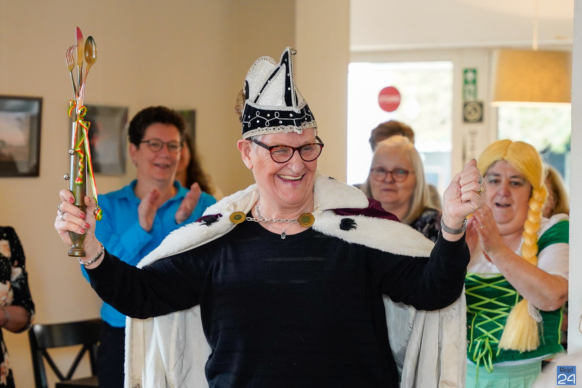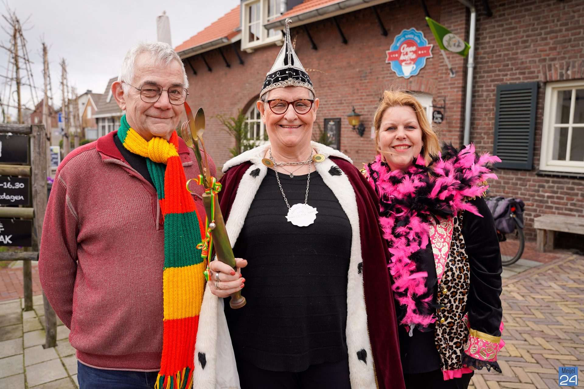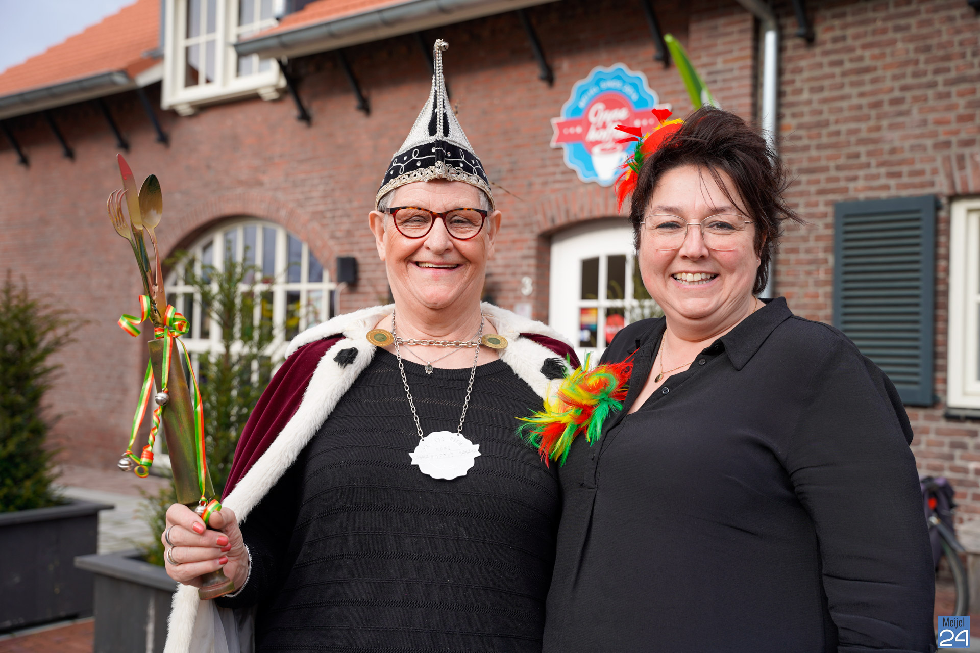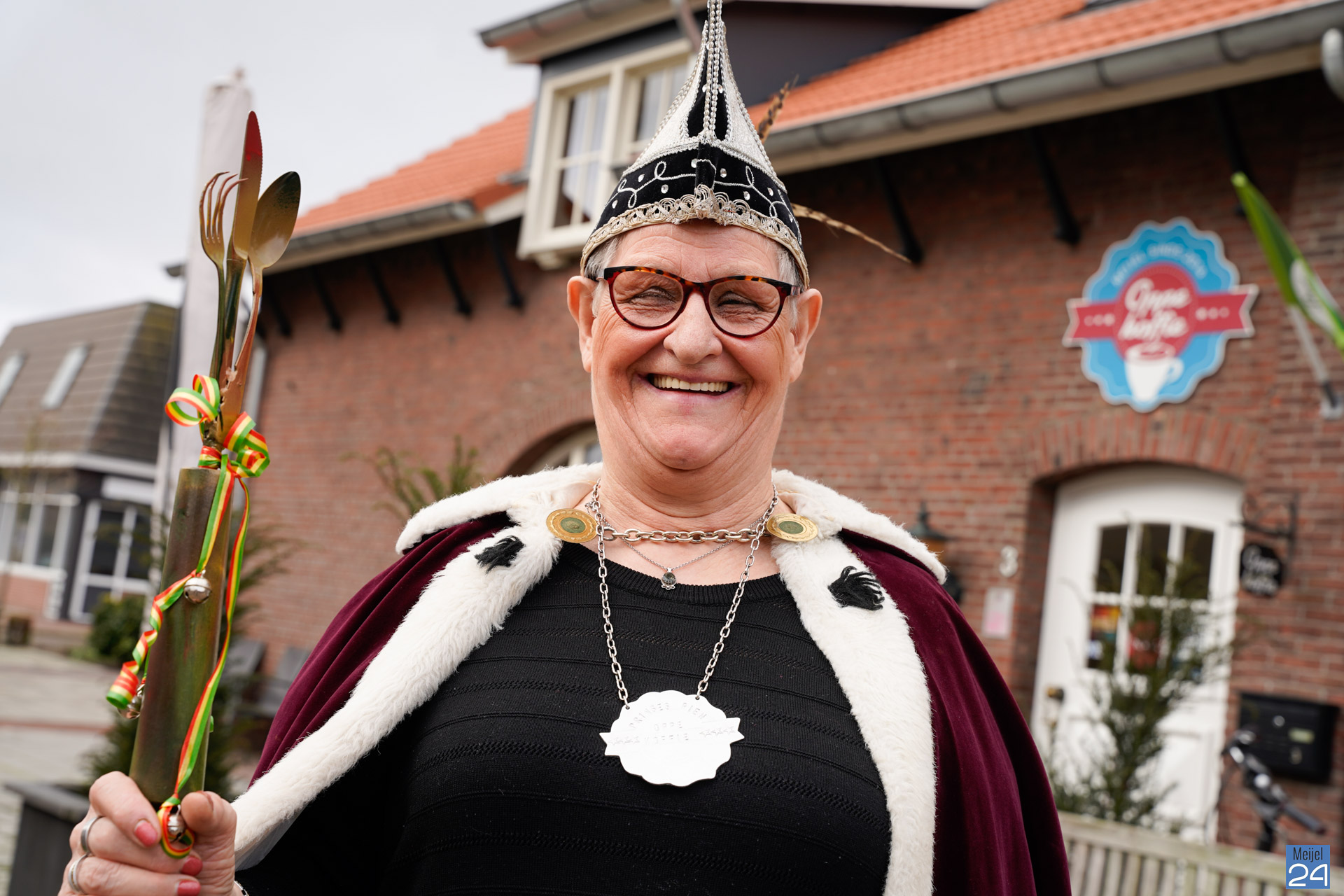 En toen kwam het hoge woord eruit: Rien Evers is de prinses van Oppe Koffie 2023! Rien werd naar voren gehaald en kreeg een cape, steek en scepter, wat haar meteen als prinses liet stralen. Daarna was het natuurlijk tijd voor een spreuk. Aangestaard door vriend en dochter, collega’s en gasten riep ze uit volle borst: “Ik zeg rèècht vur zin raap en érrelik as gòwt: Géj bèènt de beeste as ge van vastelaovend háwd!”