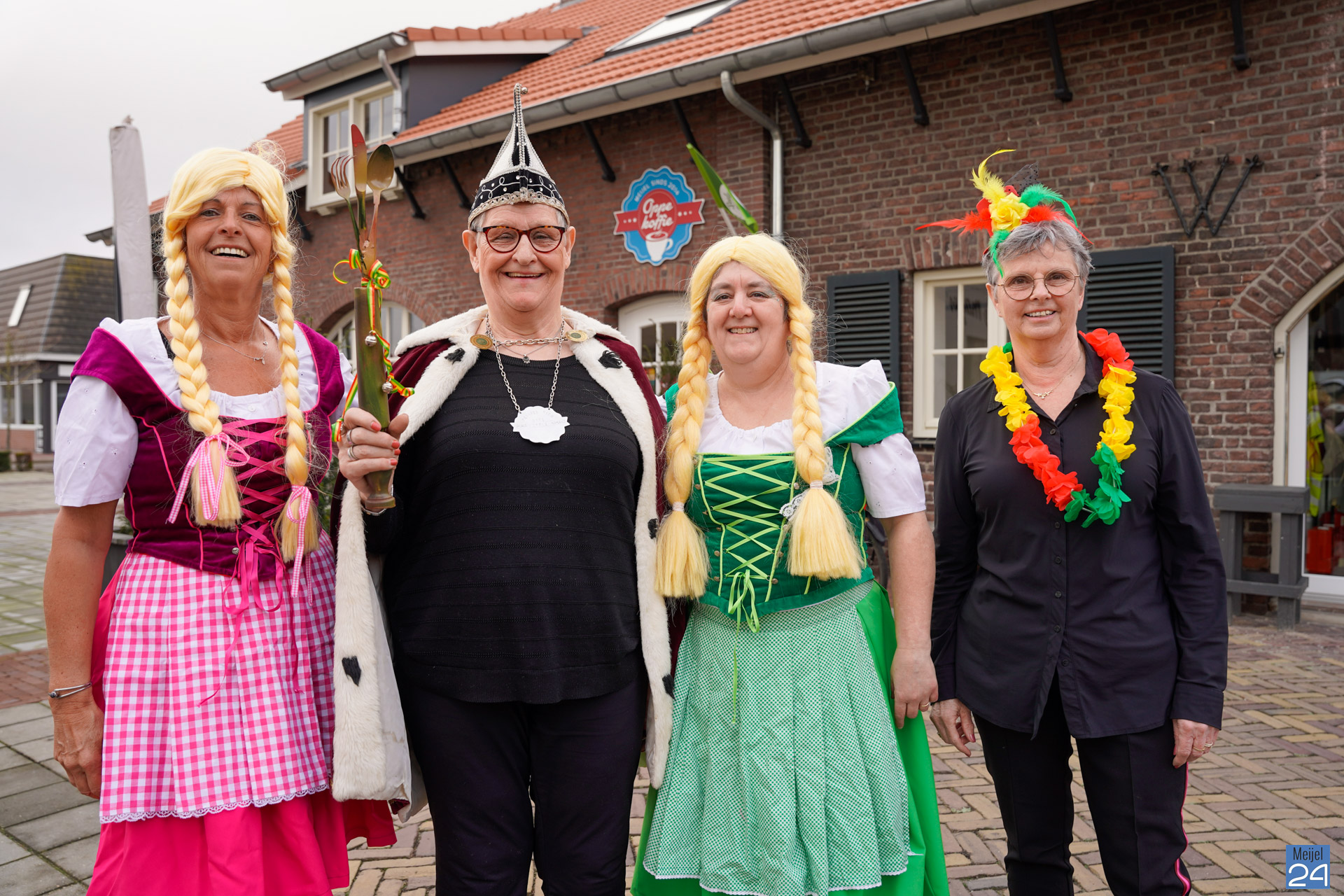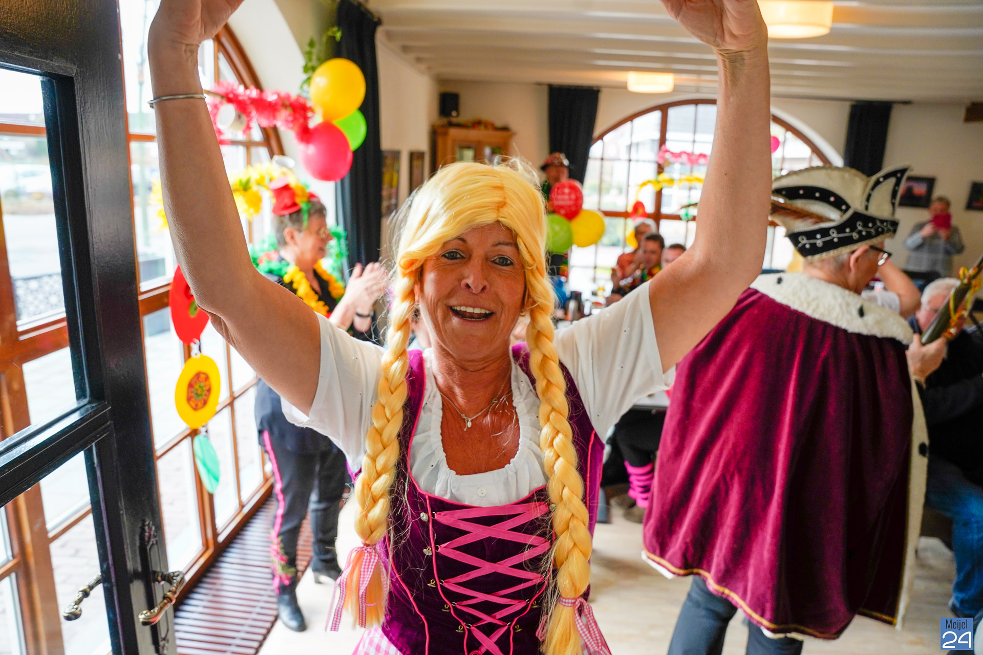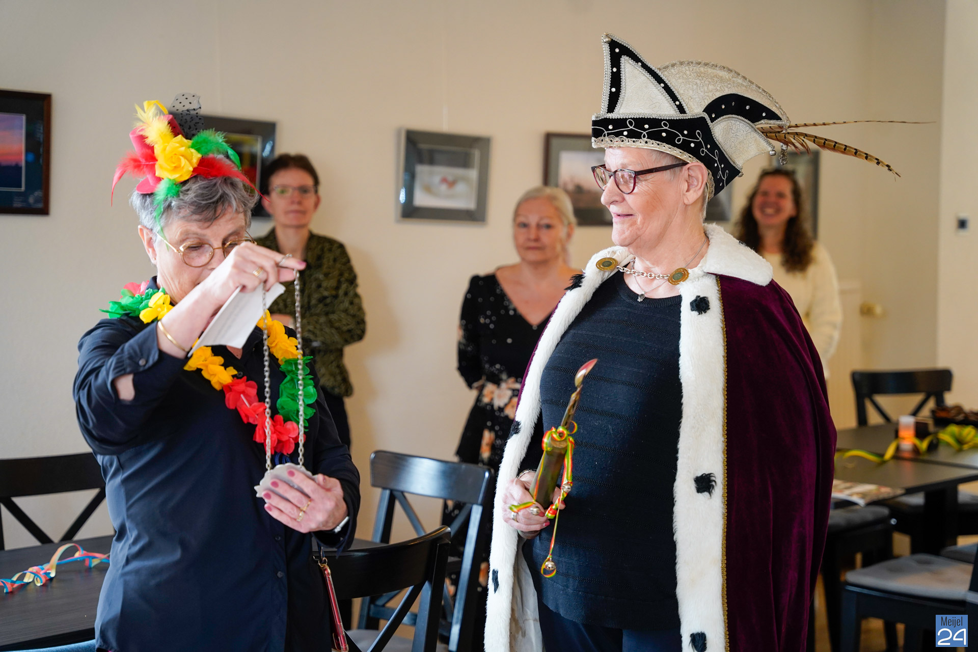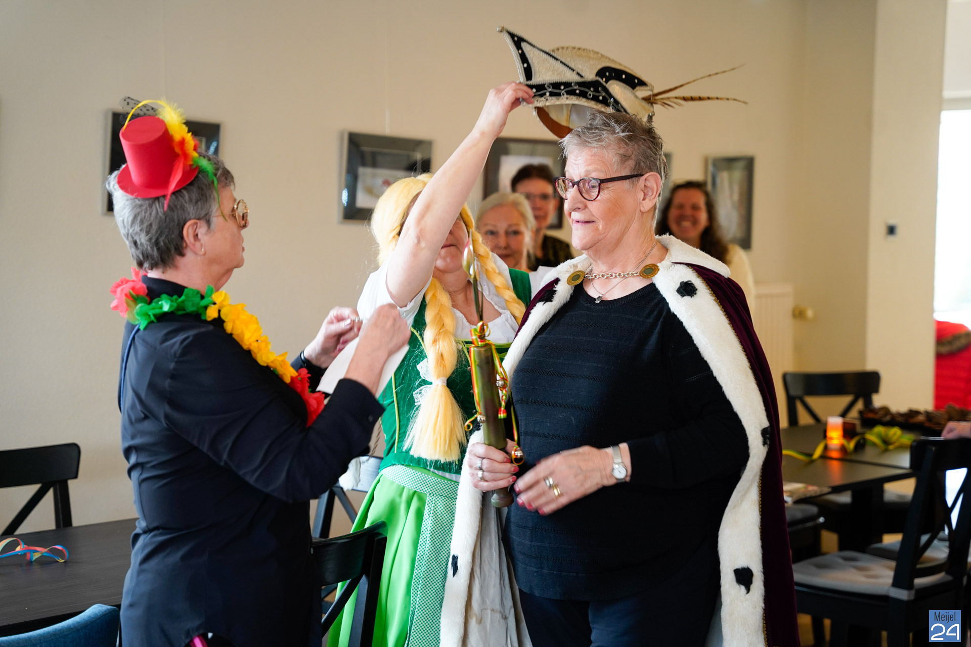 En toen kwam het hoge woord eruit: Rien Evers is de prinses van Oppe Koffie 2023! Rien werd naar voren gehaald en kreeg een cape, steek en scepter, wat haar meteen als prinses liet stralen. Daarna was het natuurlijk tijd voor een spreuk. Aangestaard door vriend en dochter, collega’s en gasten riep ze uit volle borst: “Ik zeg rèècht vur zin raap en érrelik as gòwt: Géj bèènt de beeste as ge van vastelaovend háwd!”