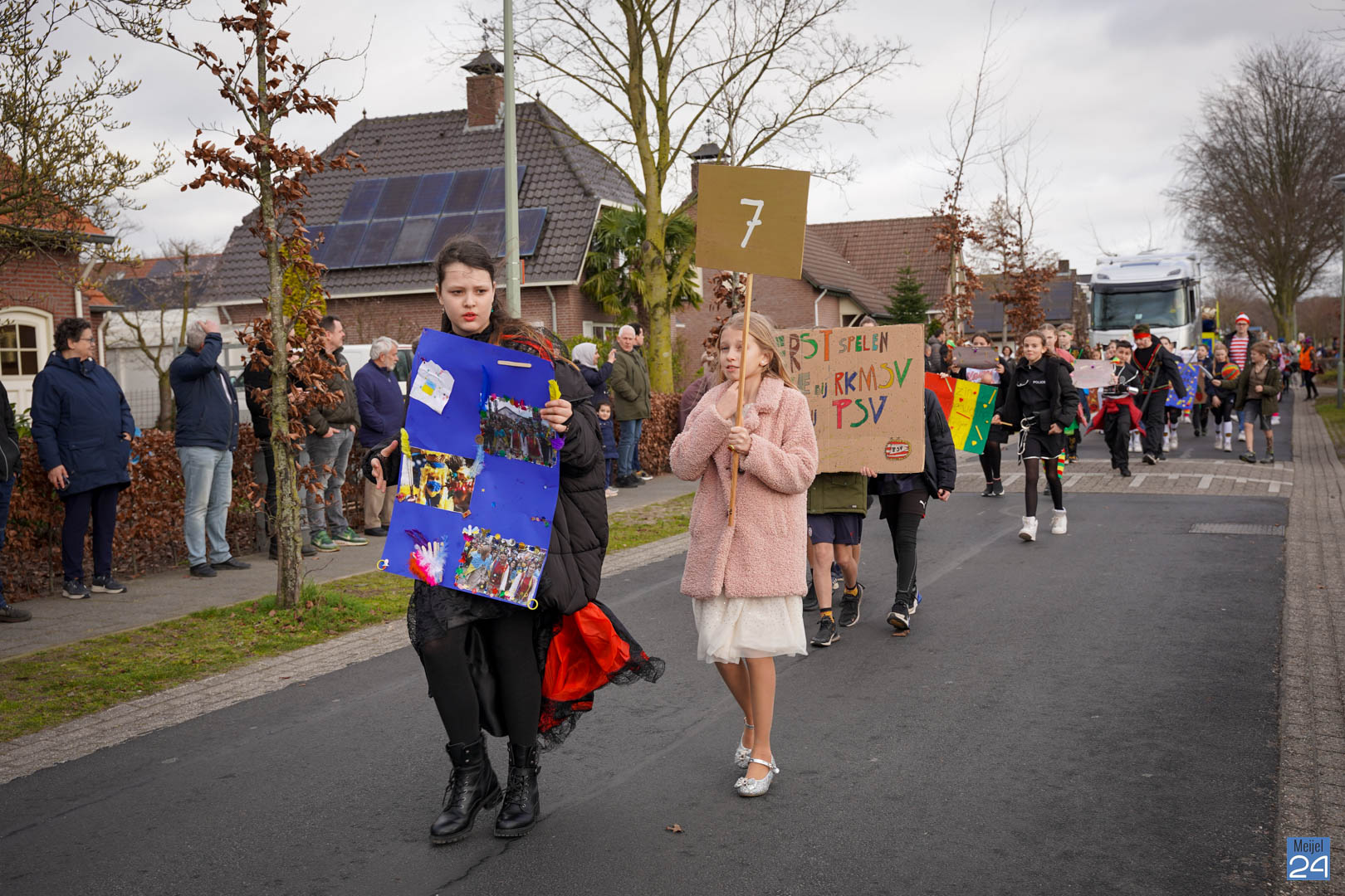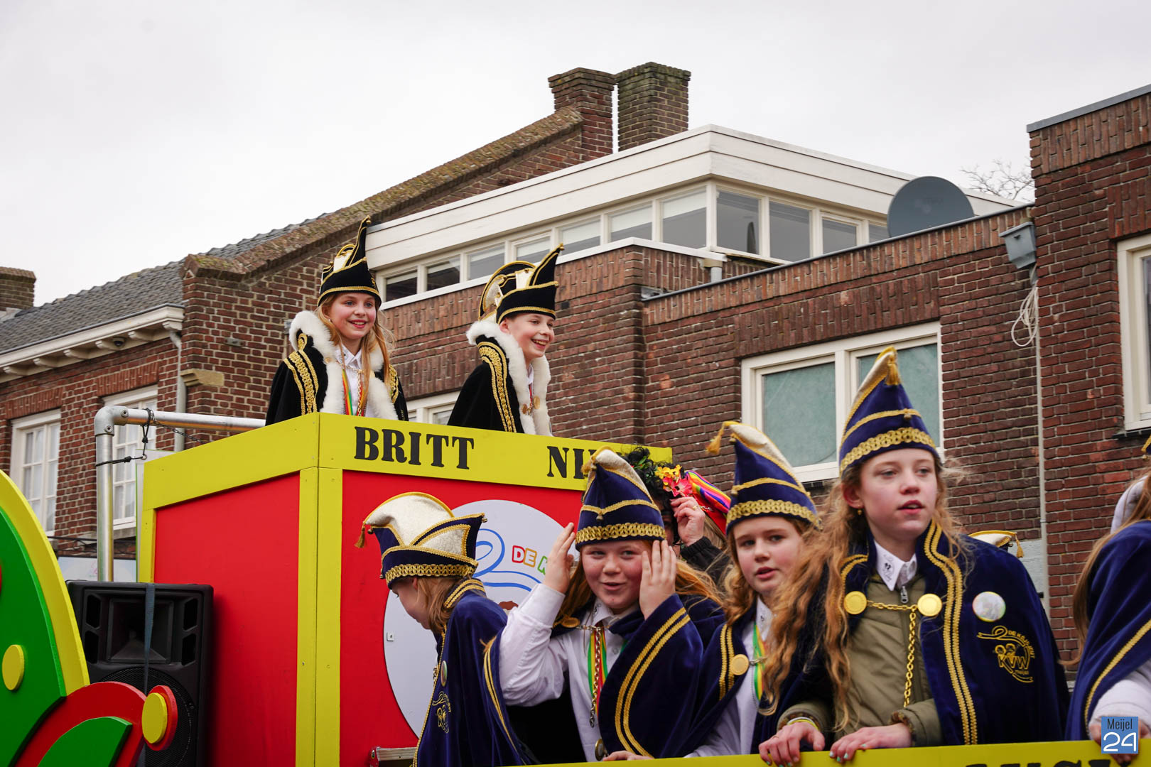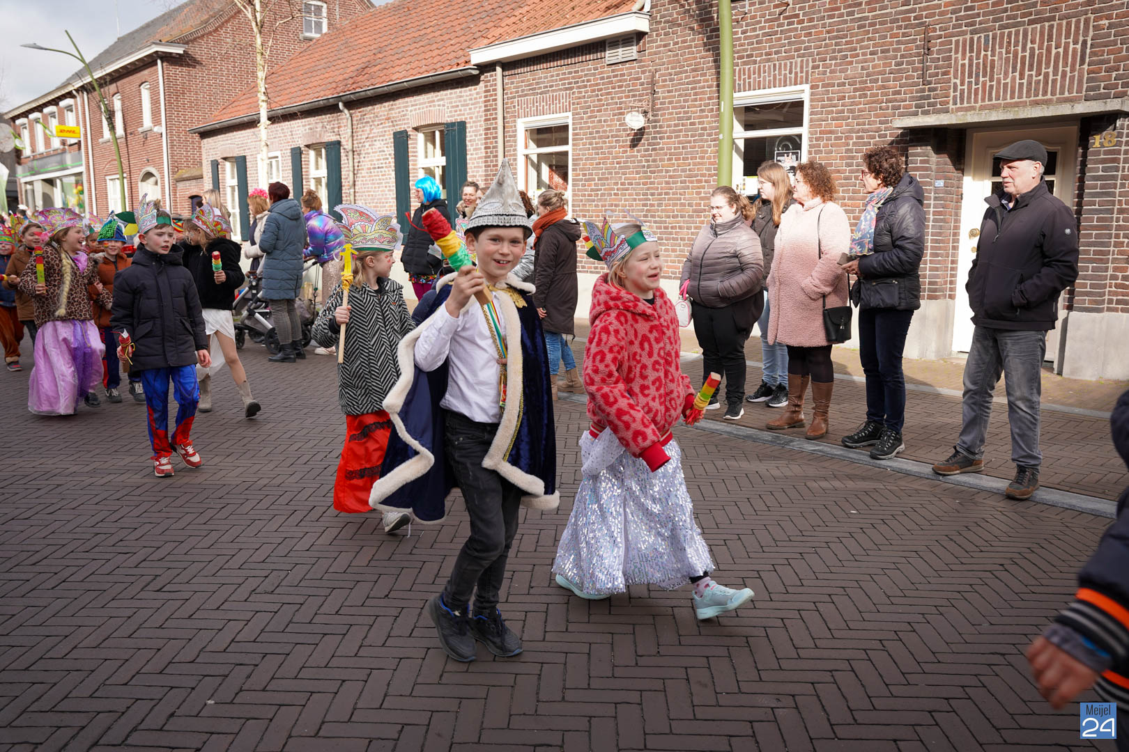 De kinderen van basisschool Den Doelhof zijn voor deze optocht al enkele weken druk bezig geweest met het bedenken en maken van leuke spreuken en creaties. Op deze feestelijke dag kregen de kinderen van Den Doelhof bezoek van de Kieveloeët met natuurlijk Prins Erwin I. Ook ‘De Grúún van Méél’ waren aanwezig om deze bonte storm muzikaal te ondersteunen.