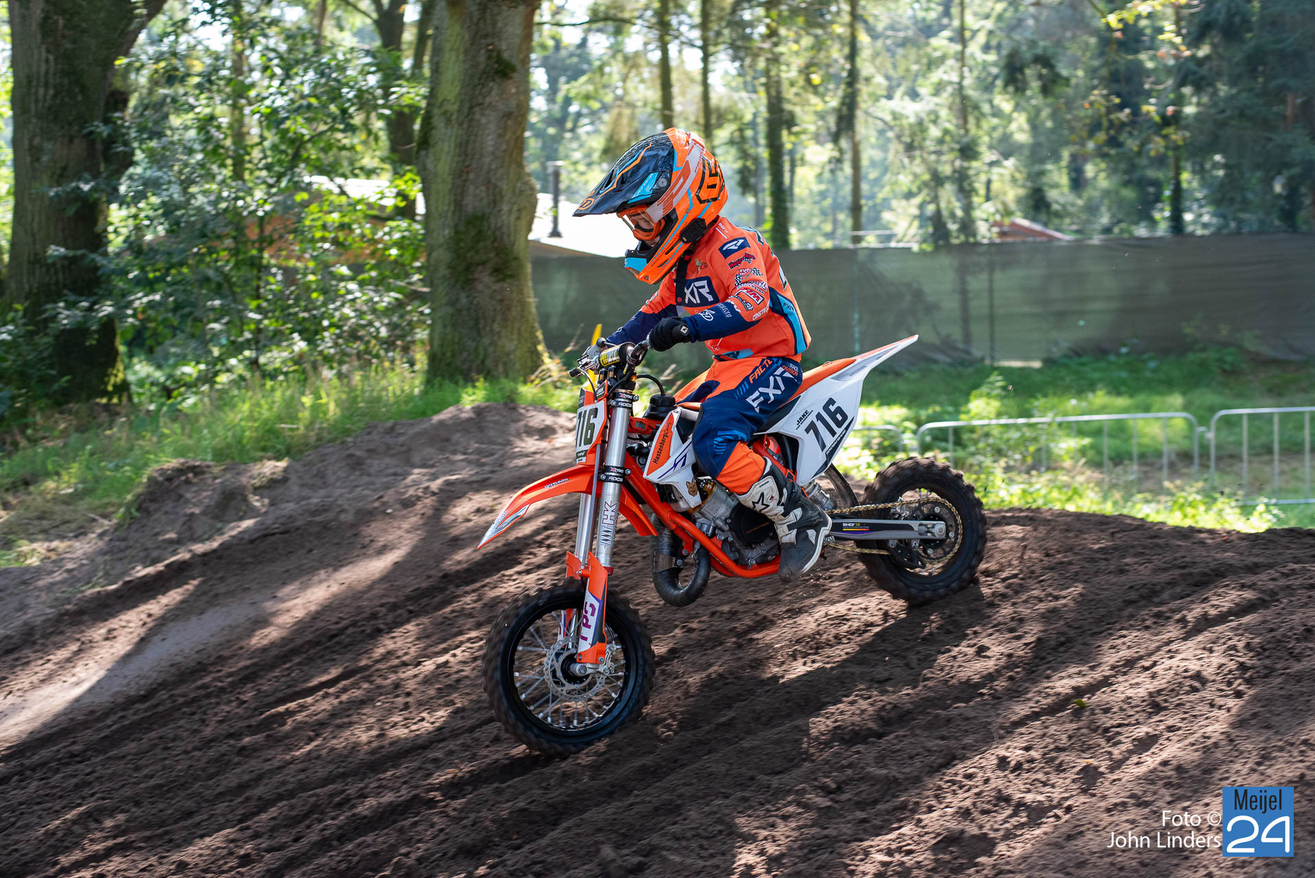 Op een zonovergoten circuit “De Vossenberg” in Meijel kwamen vandaag veel motoren aan de start. Op zaterdag zijn er de clubkampioenschappen en rijden er veel jeugdige op de baan. Na de trainingsritten vanmorgen werden de manches verreden. Voor de stoere mannen en vrouwen op de kleine 50cc motoren is er speciaal een korte baan beschikbaar. Ook in deze klasse gaat het gas er al flink op. Ook bij de papa’s langs de baan wordt er in gedachte ook gas gegeven en wordt er flink aangemoedigd.
