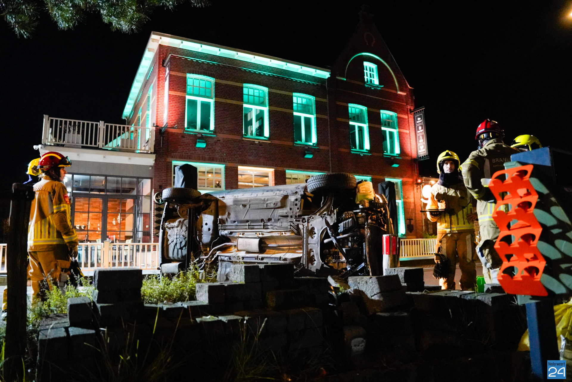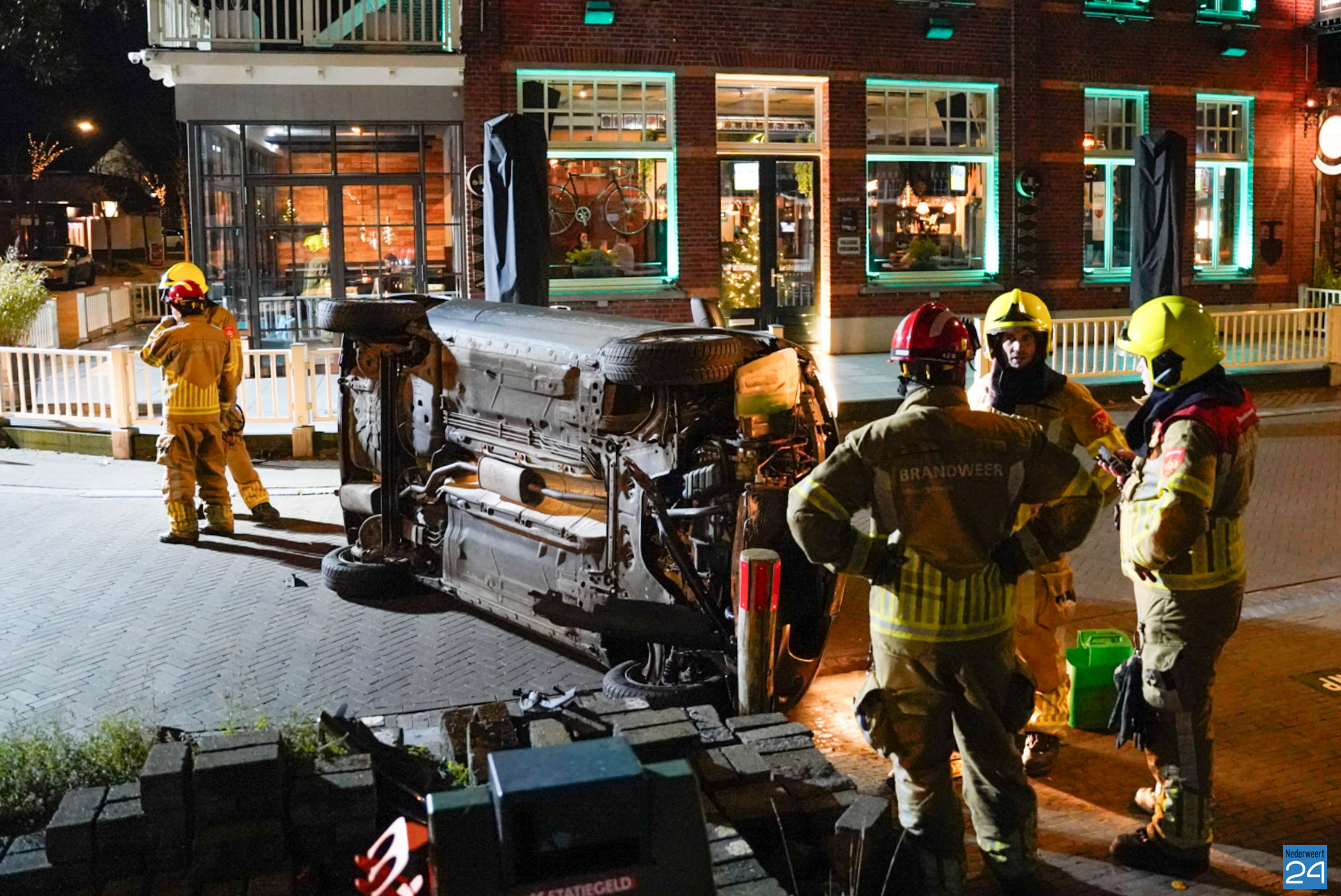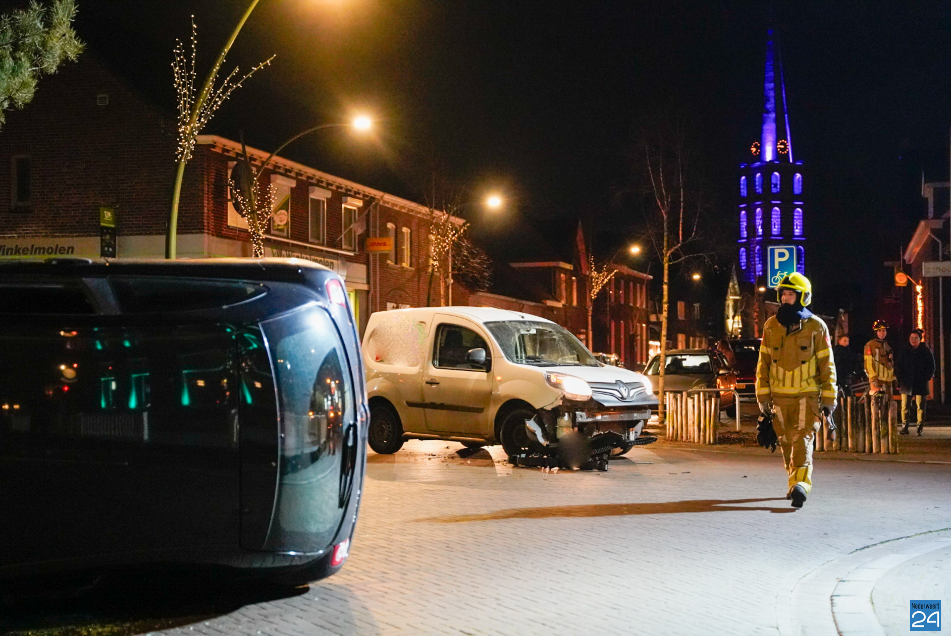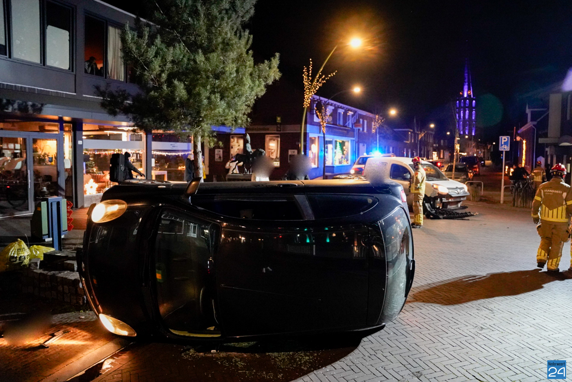 Een personenauto is donderdagavond na botsing met een bedrijfsauto op de zijkant beland in de Dorpsstraat in Meijel.