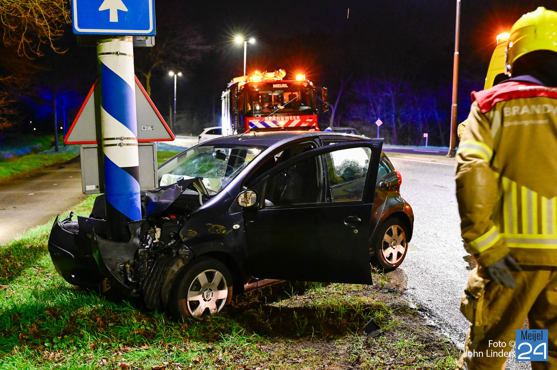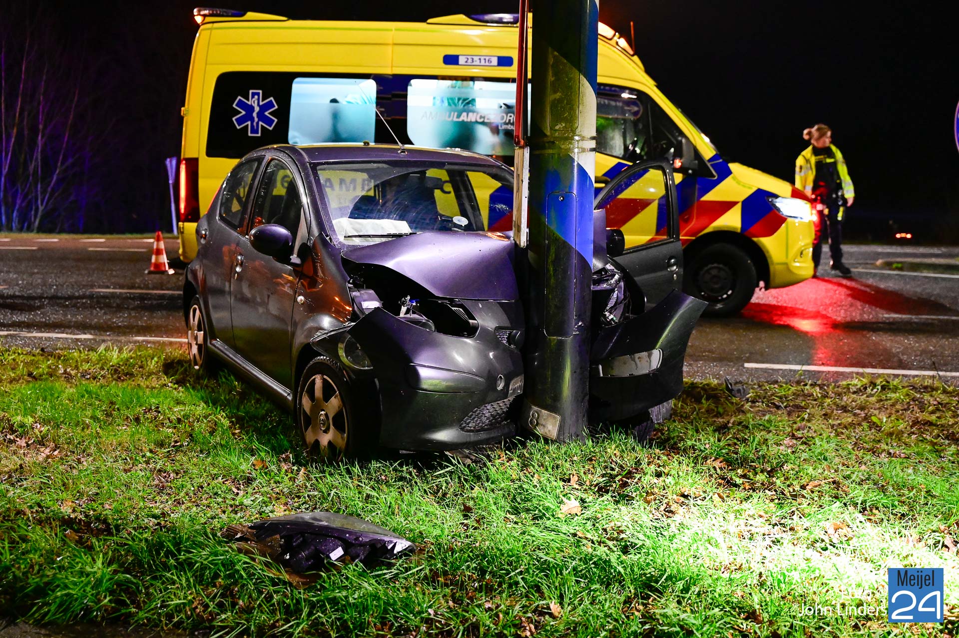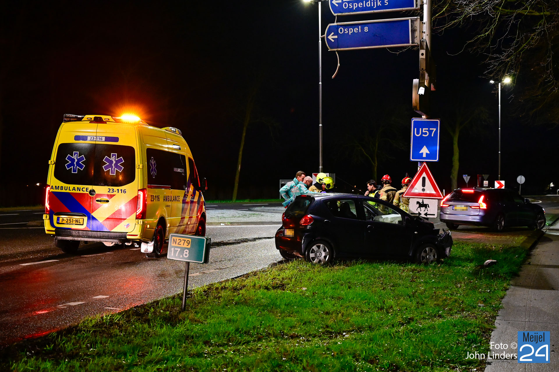 Een auto reed vanuit Ospel richting Meijel. Bij de t-splitsing ging het mis. Door nog onbekende oorzaak knalde de bestuurder met zijn auto hard tegen een paal van verkeersborden. De bestuurder is met ondersteuning van de brandweer en het ambulancepersoneel uit het voertuig gestapt. Hij is voor nader onderzoek meegenomen naar het ziekenhuis.