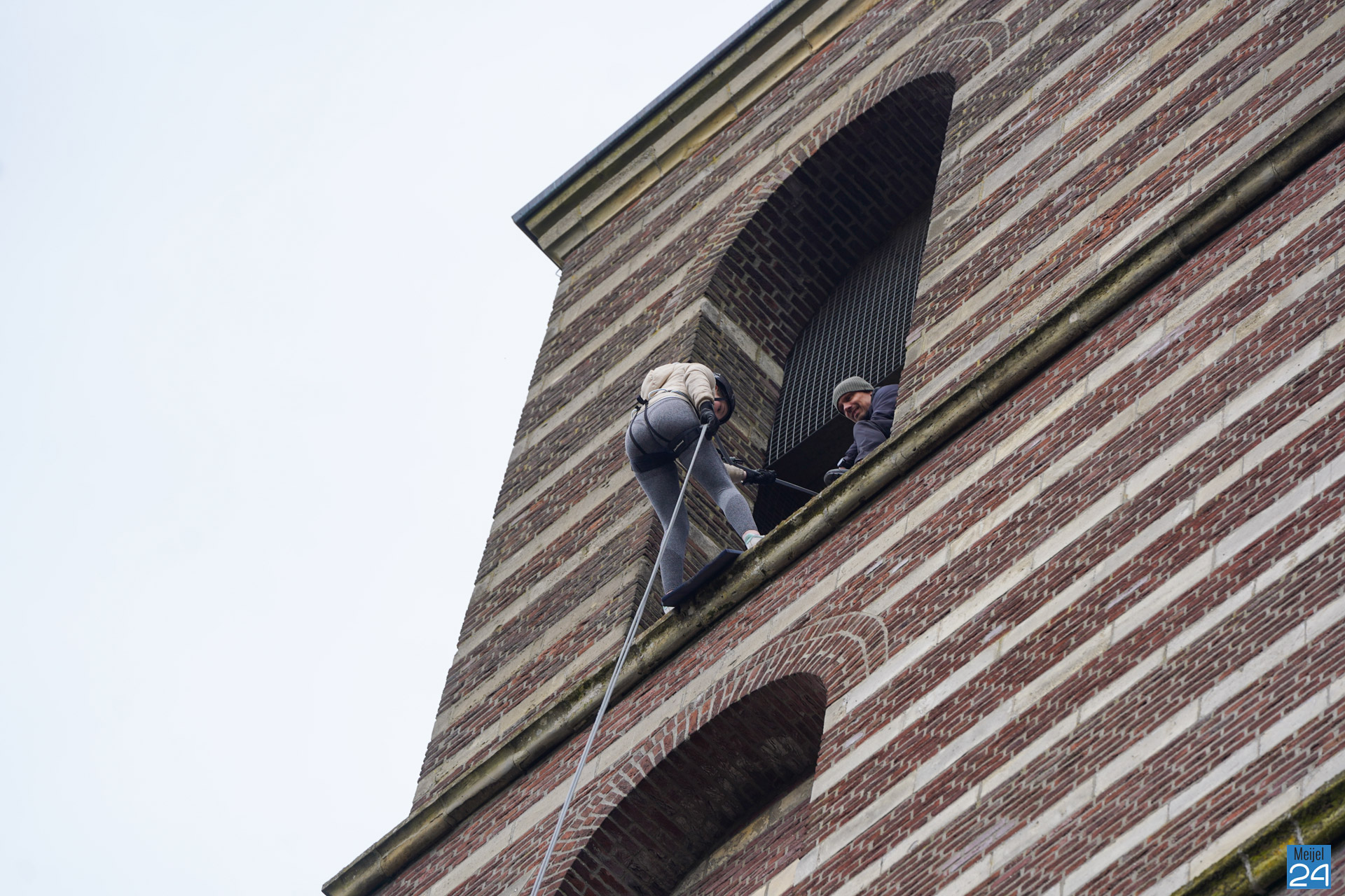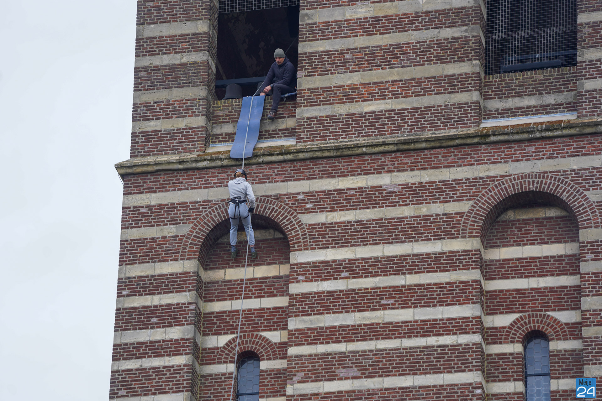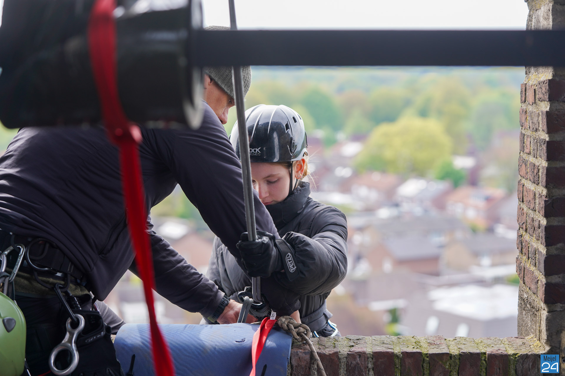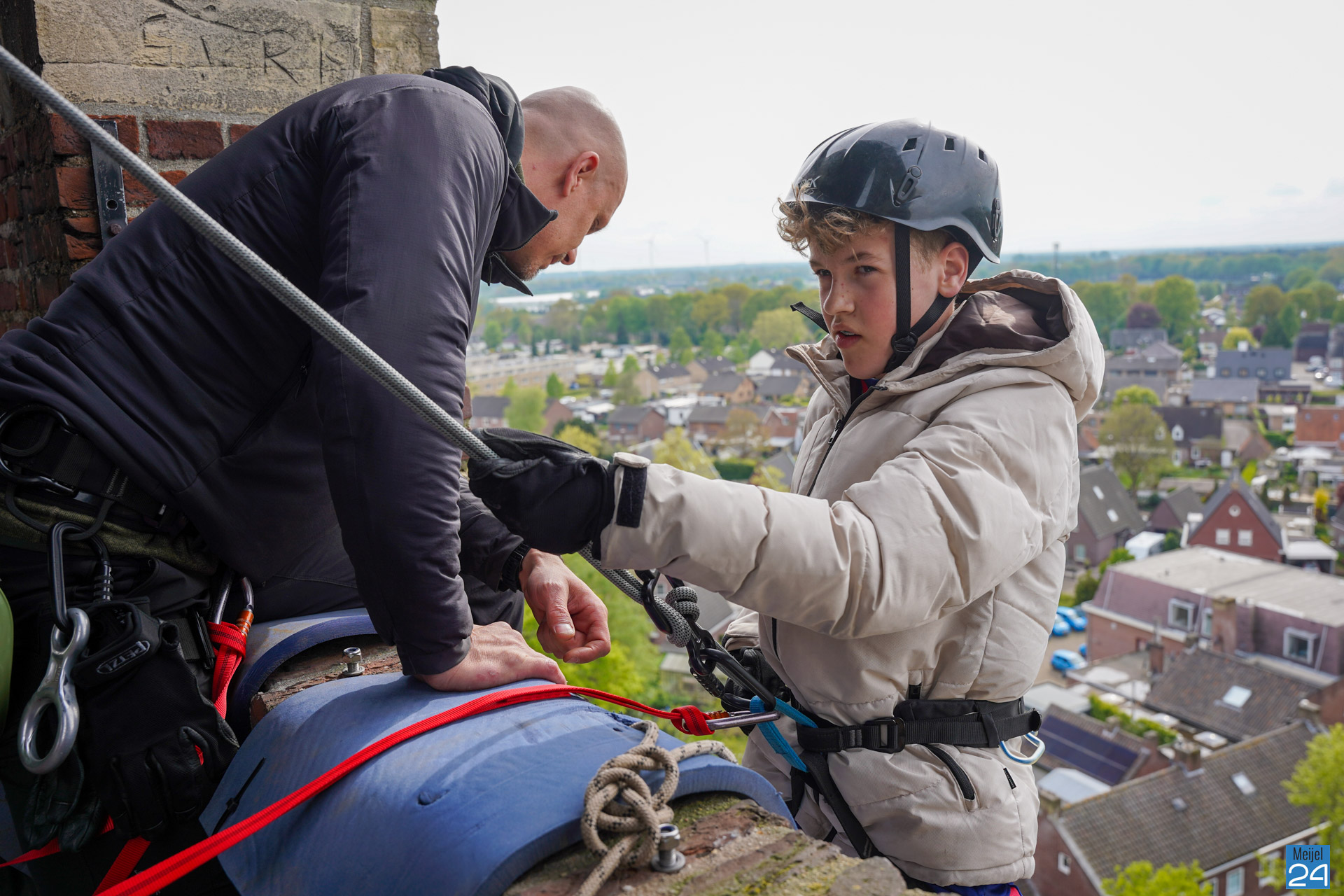 Tussen het abseilen door konden de deelnemers genieten van het uitzicht over het Meijelse dorp. Om het half uur moesten alleen de oren even dichtgehouden worden, de kerkklokken waren immers gewoon in dienst.