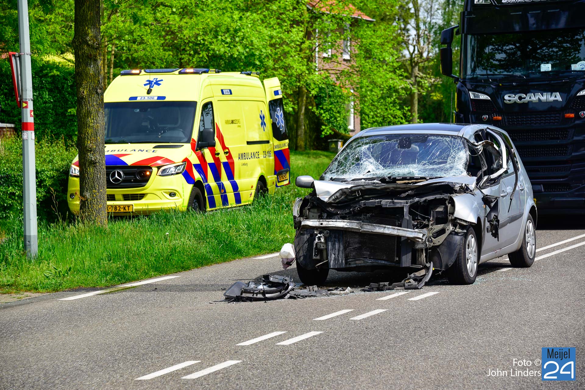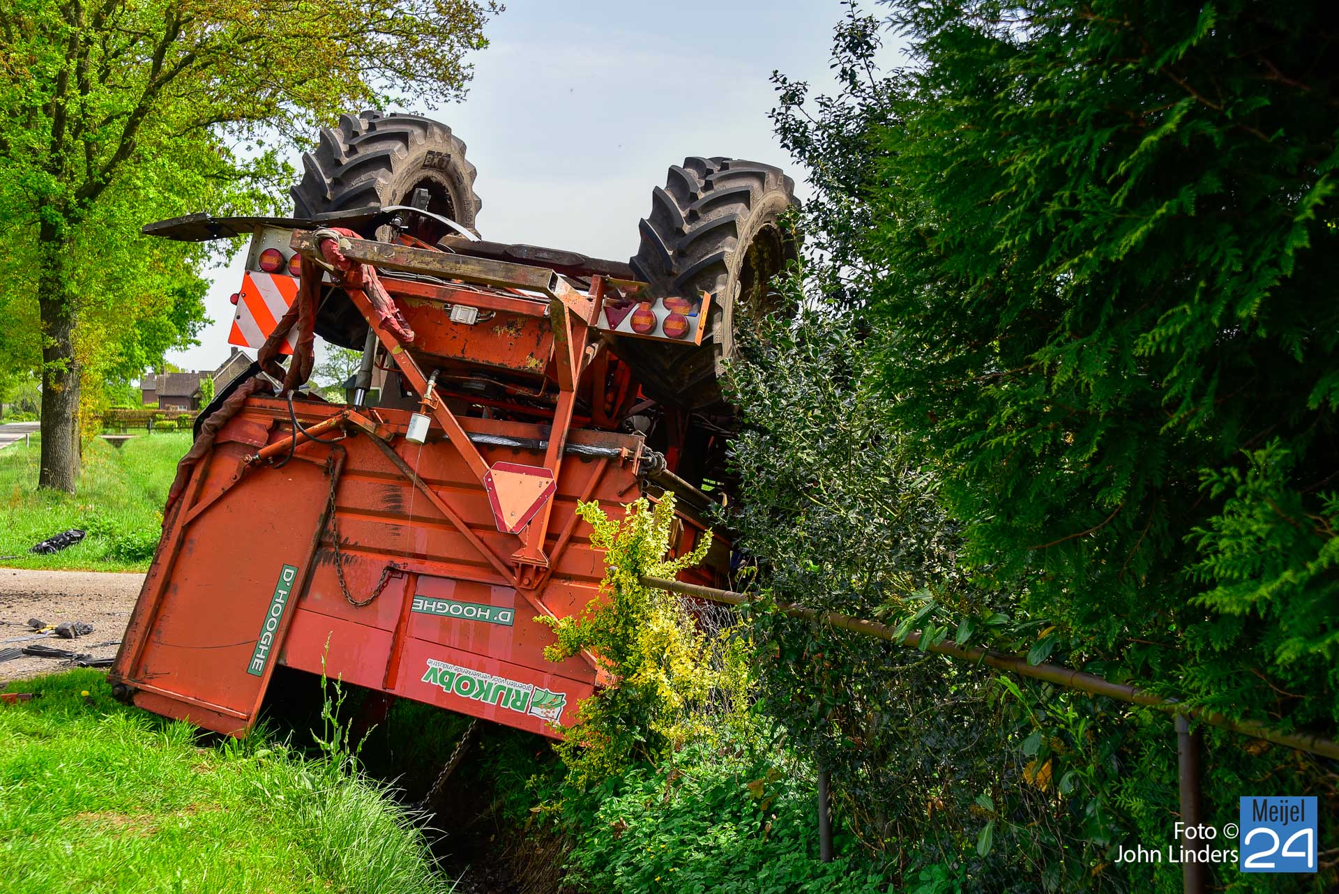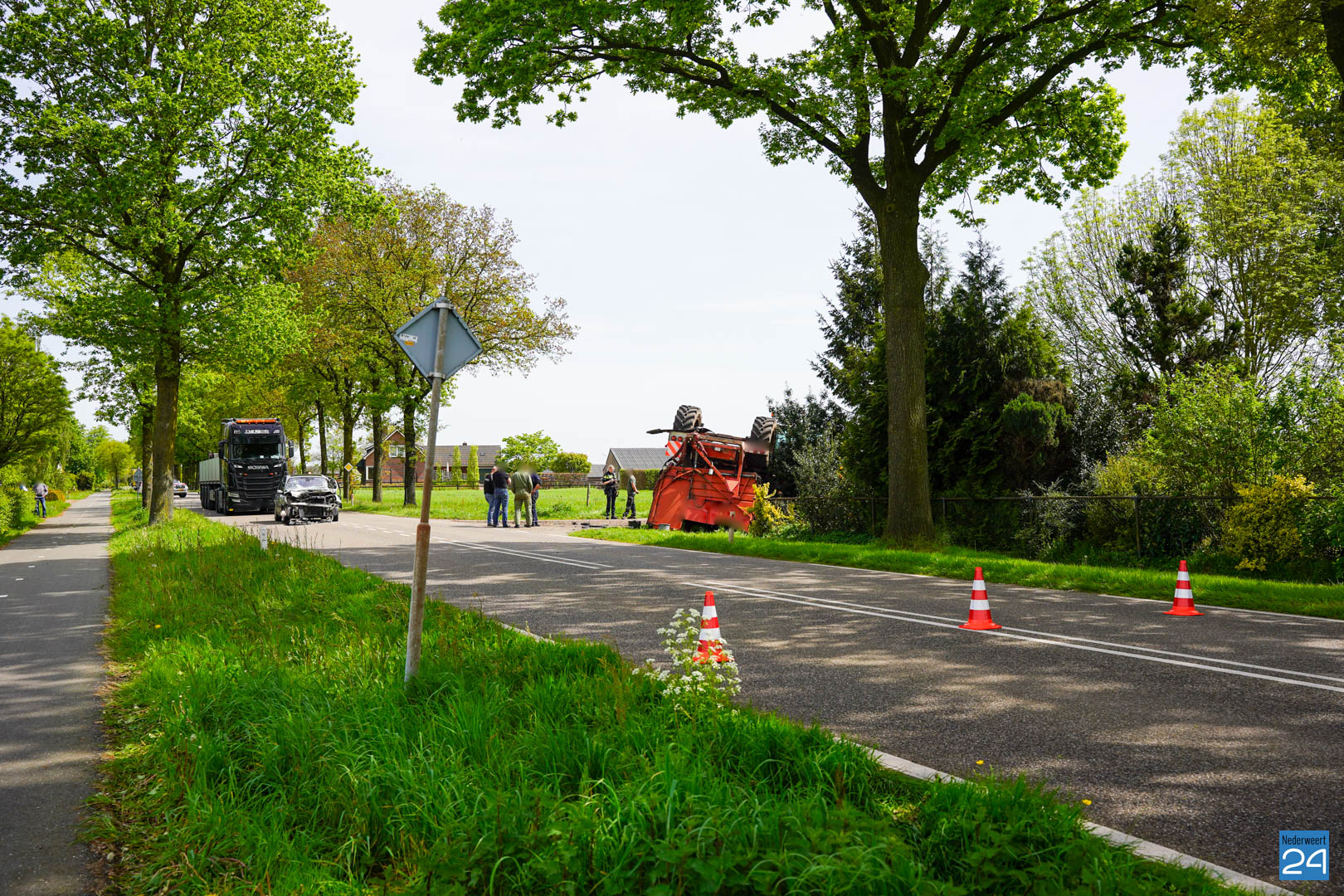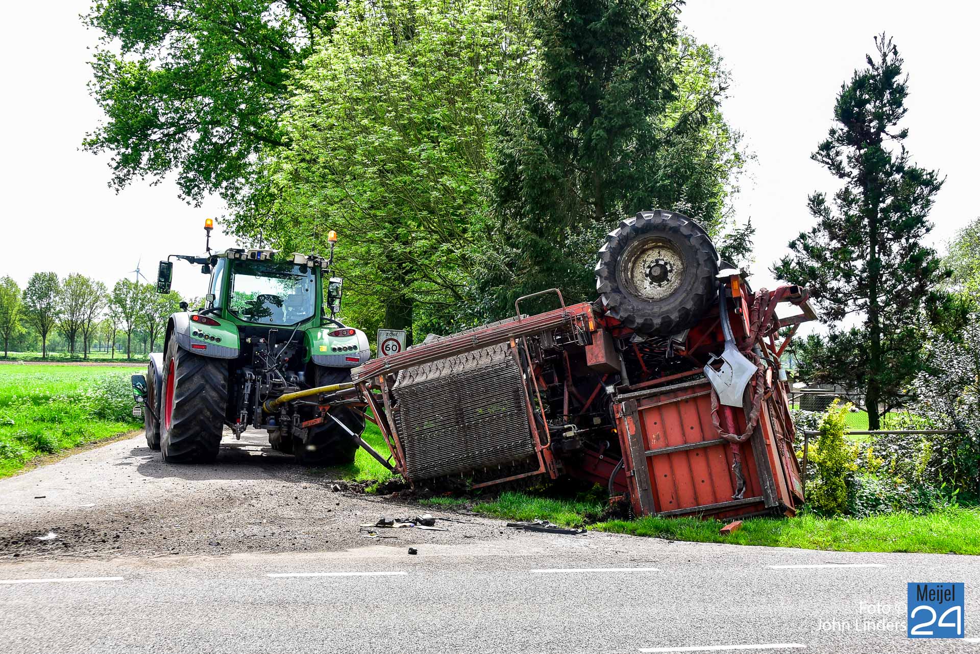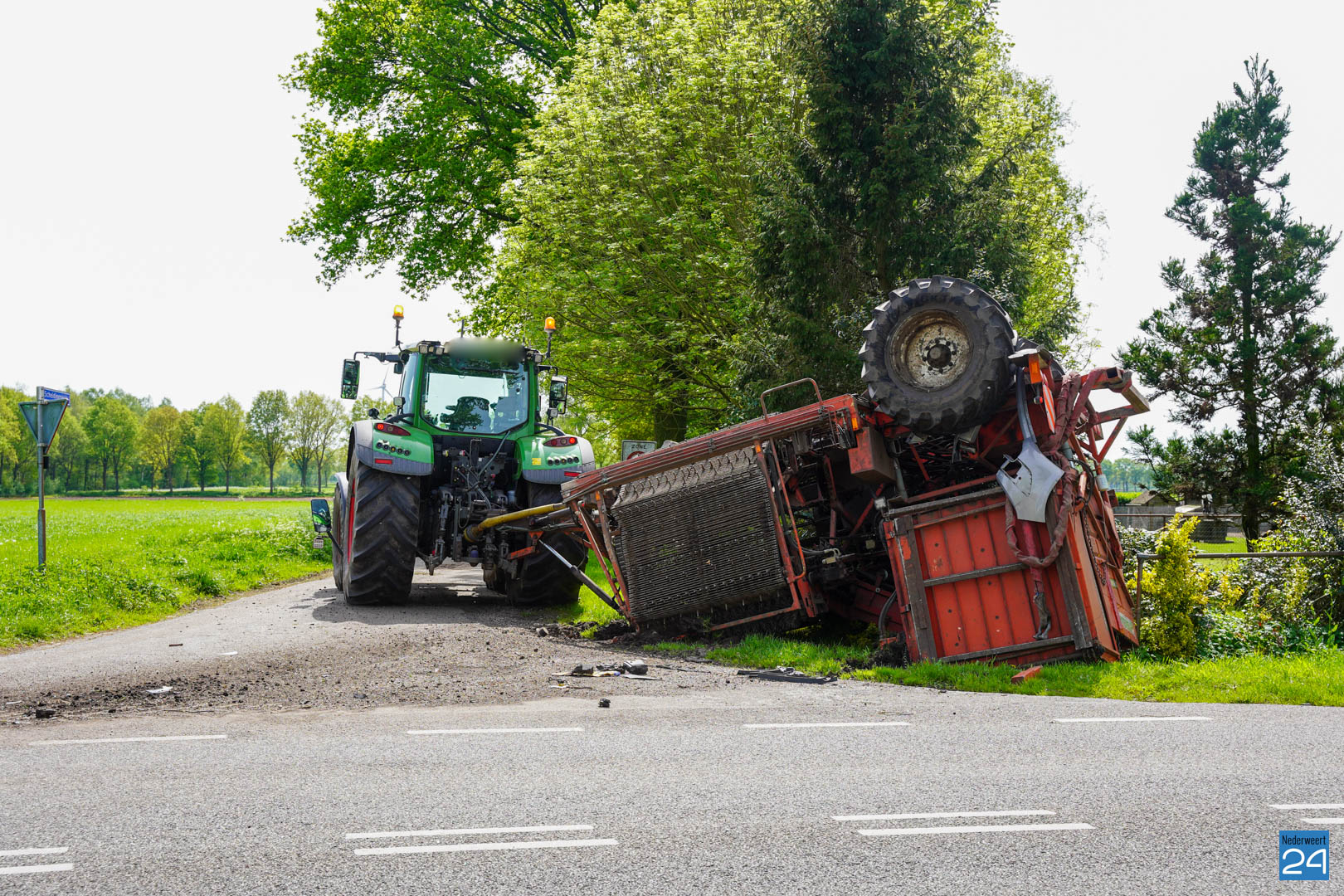 Dit gebeurde rond 12.15 uur ter hoogte van de Scheidingsweg. De bestuurder van de personenauto reed vanuit Meijel naar Nederweert en wilde een vrachtwagen en het landbouwvoertuig inhalen. Tijdens het inhalen sloeg de bestuurder van het landbouwvoertuig af naar de Scheidingsweg. De twee voertuigen kwamen hierdoor met elkaar in botsing. De rooimachine die achter de tractor hing kwam daarbij ondersteboven terecht en ook de personenauto heeft flink wat schade opgelopen.