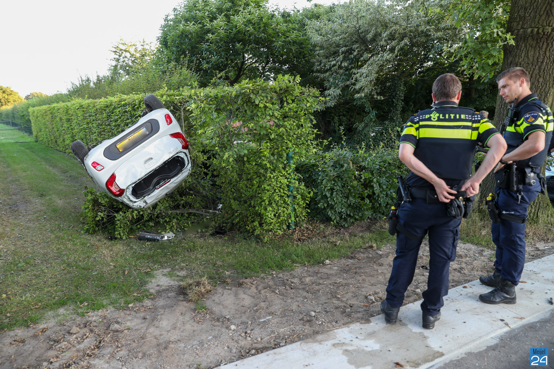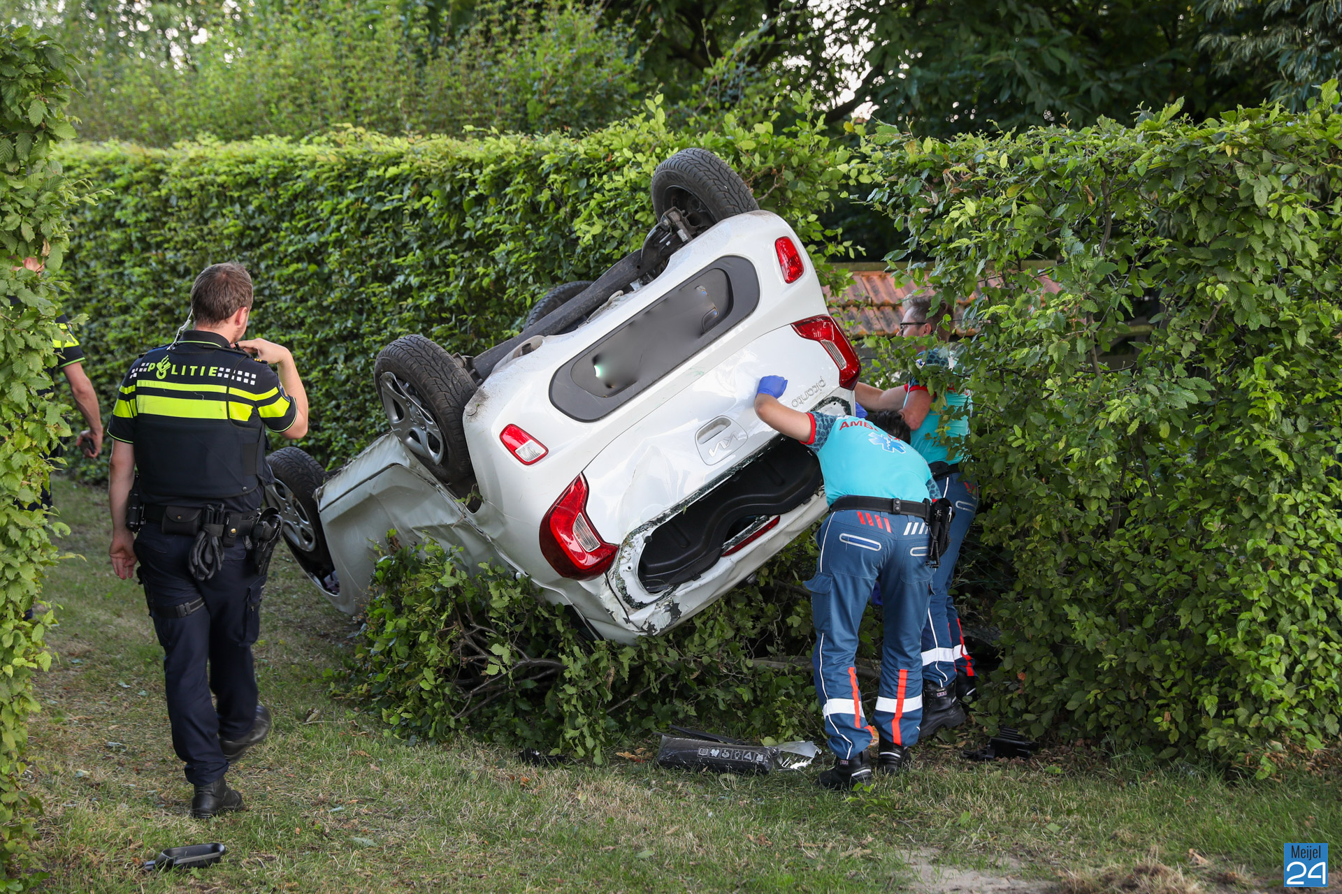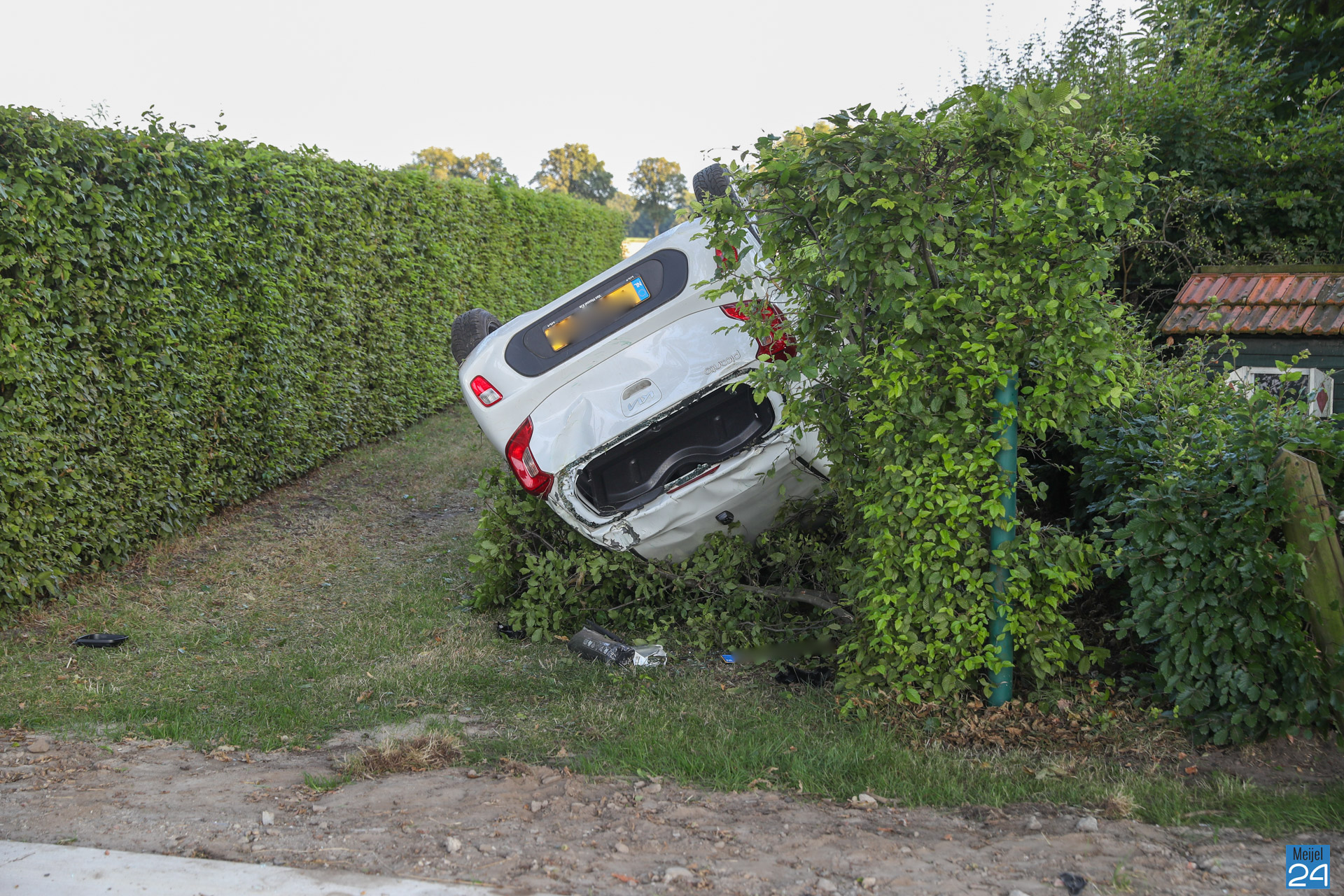 Het ongeval gebeurde rond kwart over acht. De bestuurder raakte door onbekende oorzaak een boom, vloog door de tuin van een woning en kwam op de kop aan de andere kant van een heg tot stilstand. In het voertuig zaten vier personen. Eén vrouw is lichtgewond geraakt en per ambulance overgebracht naar het ziekenhuis voor verdere behandeling.