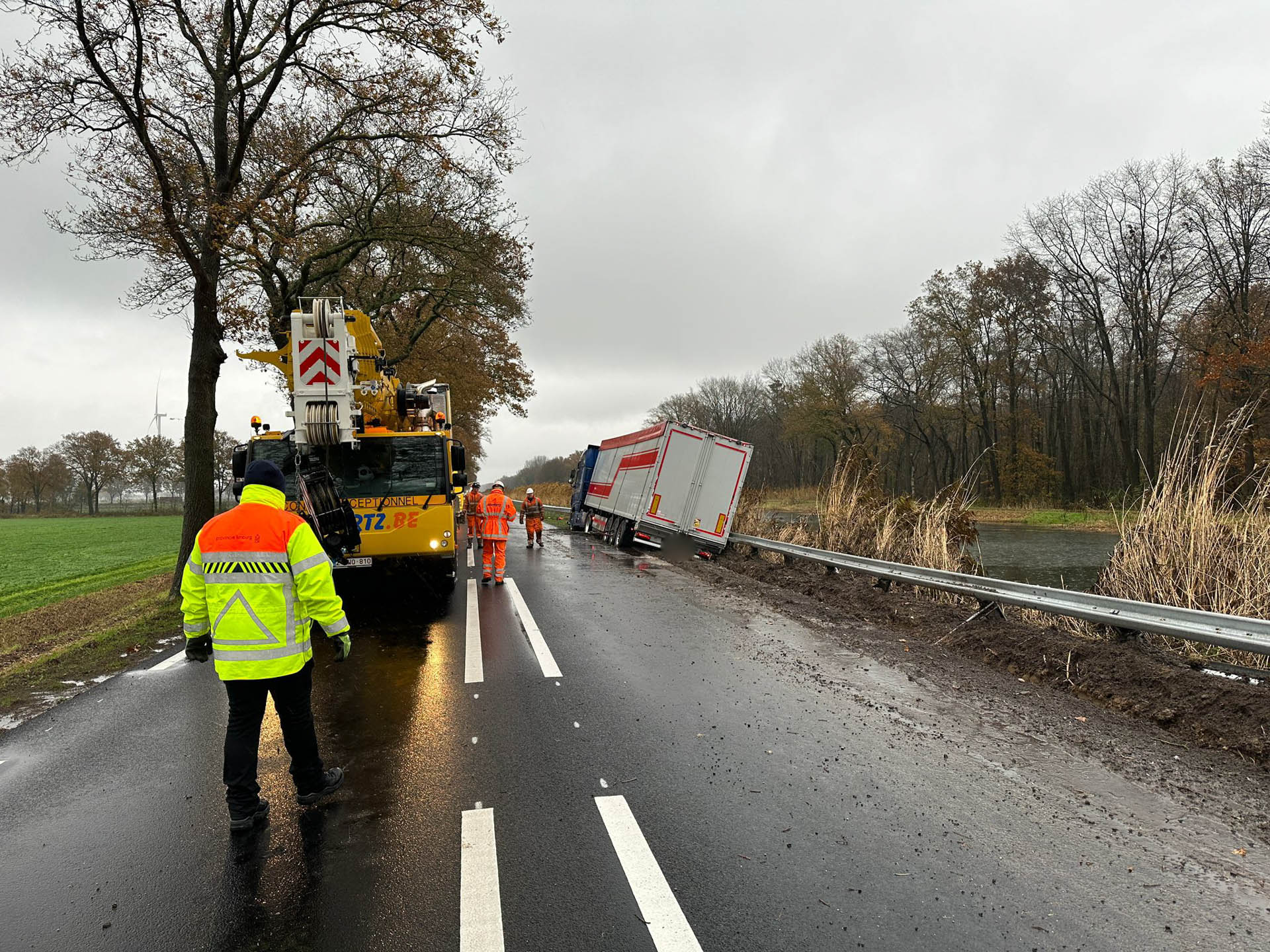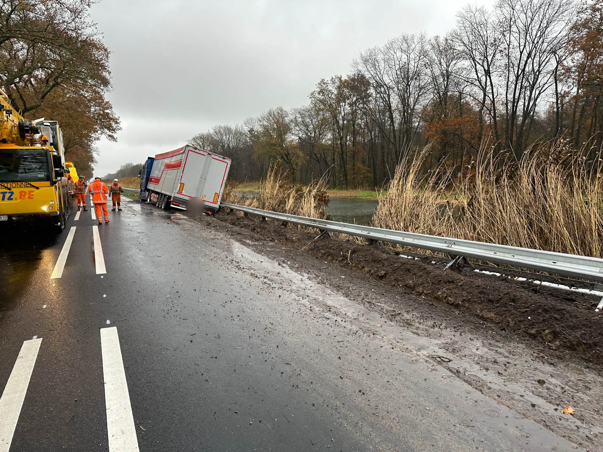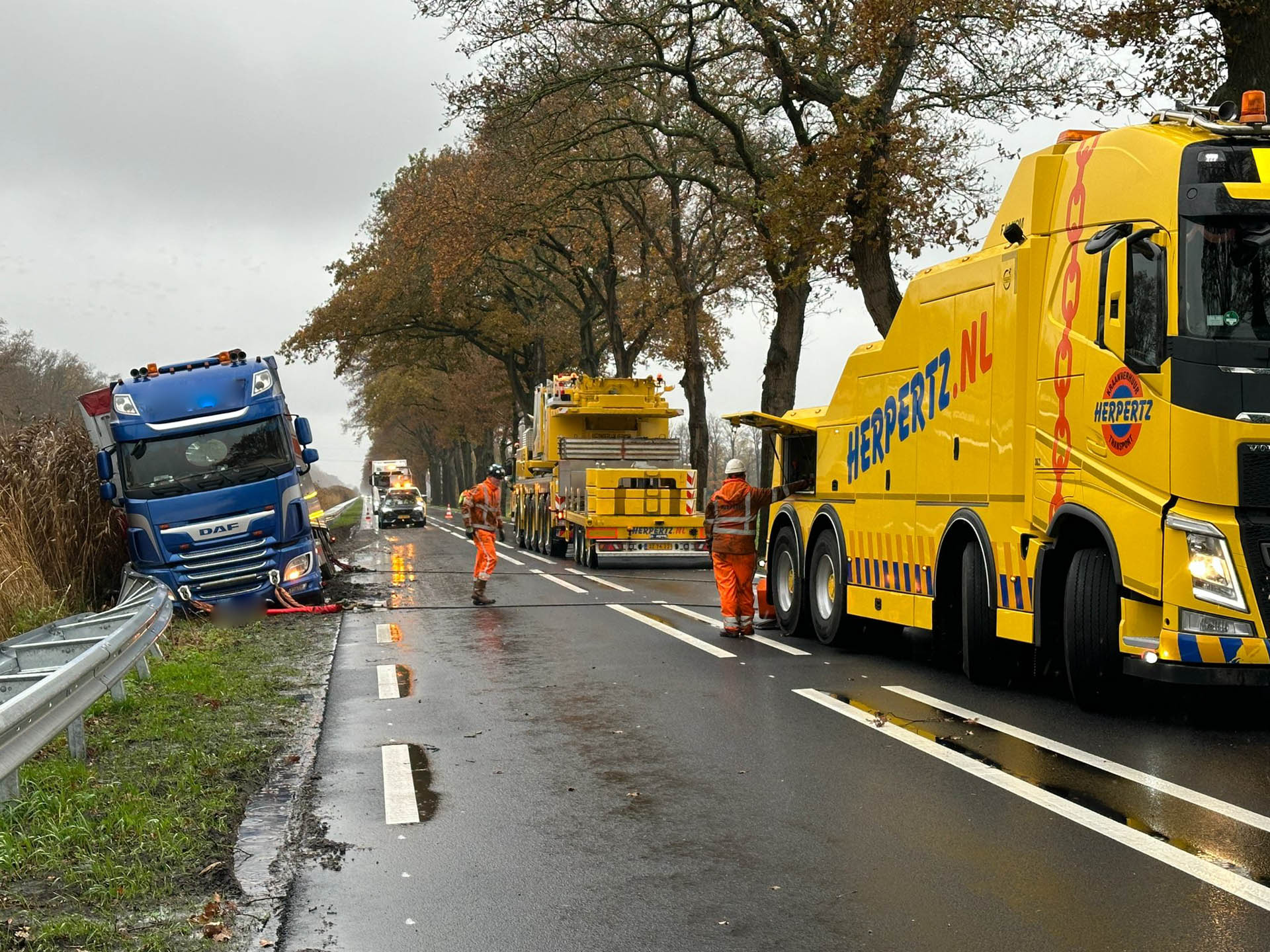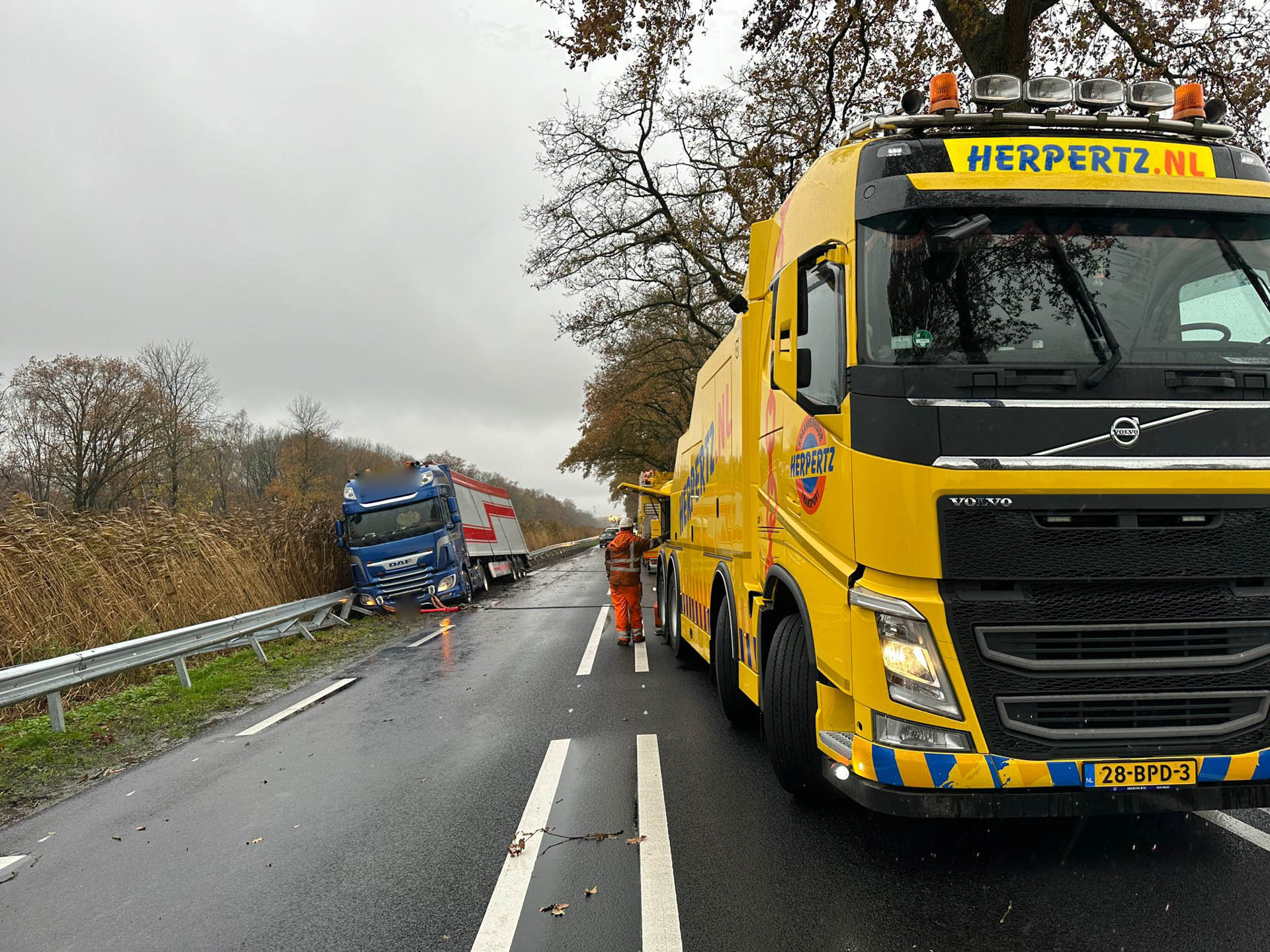 De vangrail en berm zijn aanzienlijk beschadigd geraakt bij het incident. In de komende uren wordt de vrachtwagen geborgen.