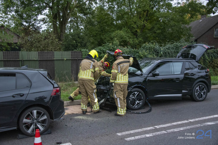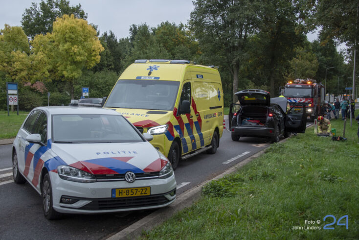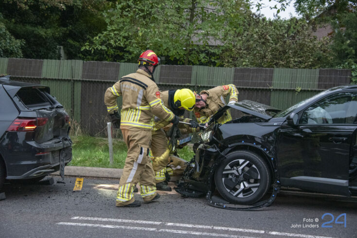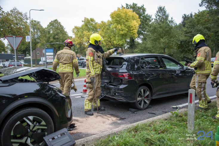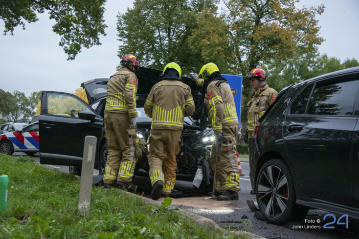 Een van de auto’s botste door nog onbekende oorzaak achterop zijn voorganger. Beide voertuigen liepen daarbij flinke schade op.