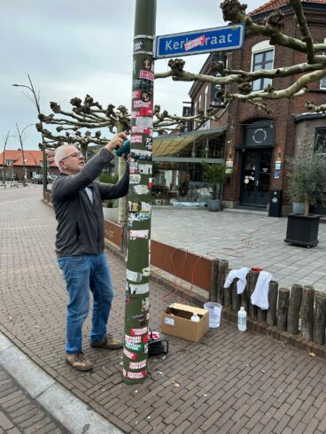 Door Meijel Schoon werd afgelopen week een schoonmaakproef uitgevoerd op de ergst vervuilde lantaarnpaal in Meijel, ze telden meer dan vijftig stickers, tegenover het terras van Grand café Restaurant Goejje. Na anderhalf uur werken met twee personen: föhnen, voorzichtig bewerken met plamuurmes, afwassen, nog eens afwassen en goed op te poetsen kregen ze deze lantaarnpaal  uiteindelijk weer schoon.