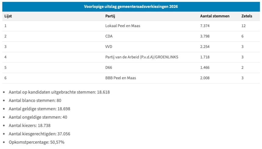 De voorlopige uitslag van de gemeenteraadsverkiezingen in de gemeente Peel en Maas is bekend. Het opkomstpercentage in de gemeente was 50,57%. Lokaal Peel en Maas heeft in de gemeente Peel en Maas de meeste stemmen gekregen. Met twee zetels meer ten opzichte van vorig jaar komen ze op 12 zetels.