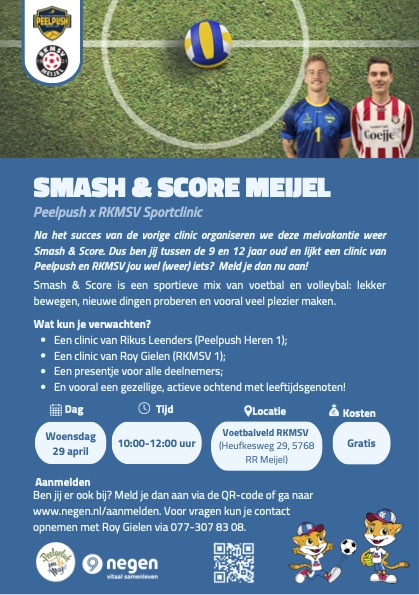 Na het succes van de vorige clinic organiseren Negen, Peelgeluk, Peelpush en RKMSV weer ‘Smash & Score’ op woensdag 29 april. Een sportieve mix van voetbal en volleybal: lekker bewegen, nieuwe dingen proberen en vooral veel plezier maken.