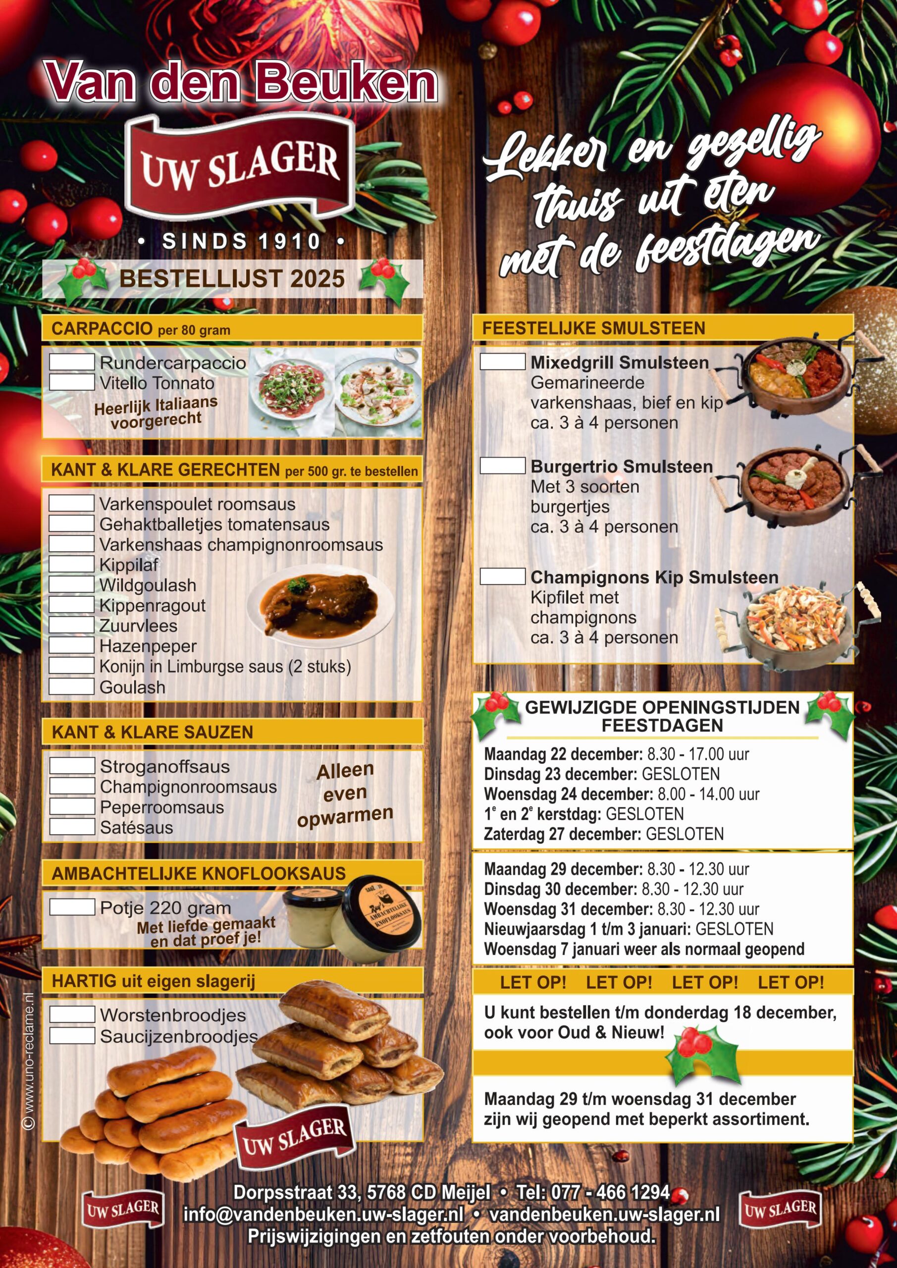 Beste klanten, in verband met de drukte met de feestdagen willen we jullie eraan herinneren om tijdig aan de kerstbestelling te denken. Kerstbestellingen maar ook voor Oud & Nieuw kunnen t/m donderdag 18 december gedaan worden. Na deze datum kunnen we helaas geen nieuwe bestellingen meer aannemen. Maar geen zorgen! Jullie zijn van harte welkom in onze slagerij, waar nog veel lekkers te vinden is.