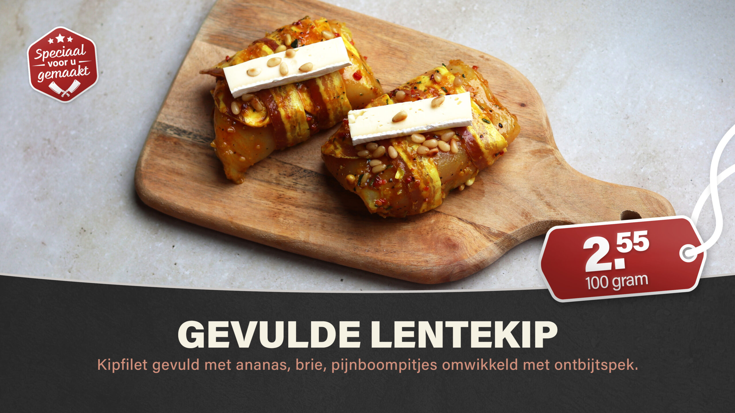 Kipfilet gevuld met ananas, brie, pijnboompitjes, omwikkeld met ontbijtspek