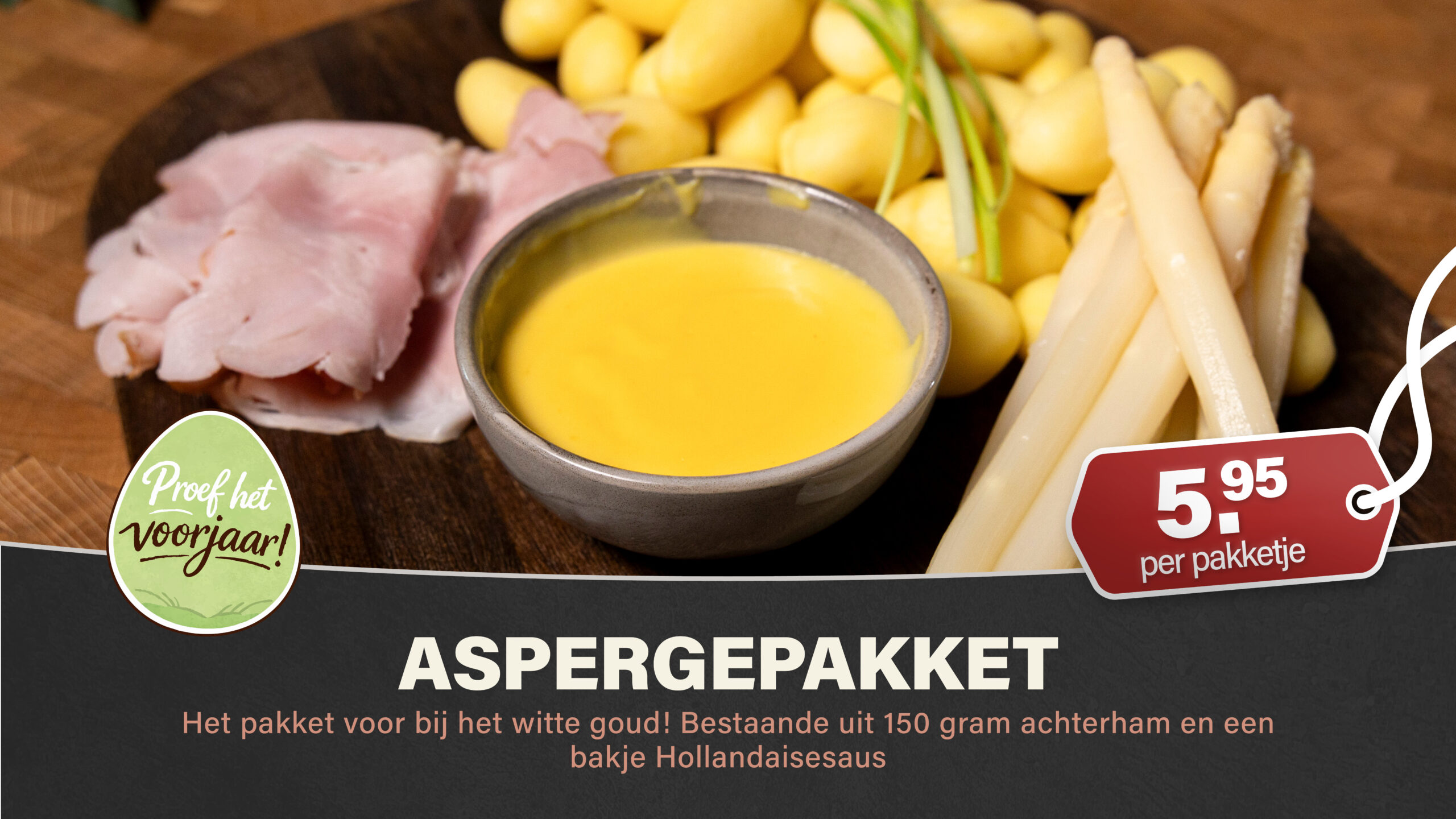 Het pakket voor bij het witte goud! Bestaande uit 150 gram achterham en een pakje hollandaisesaus.