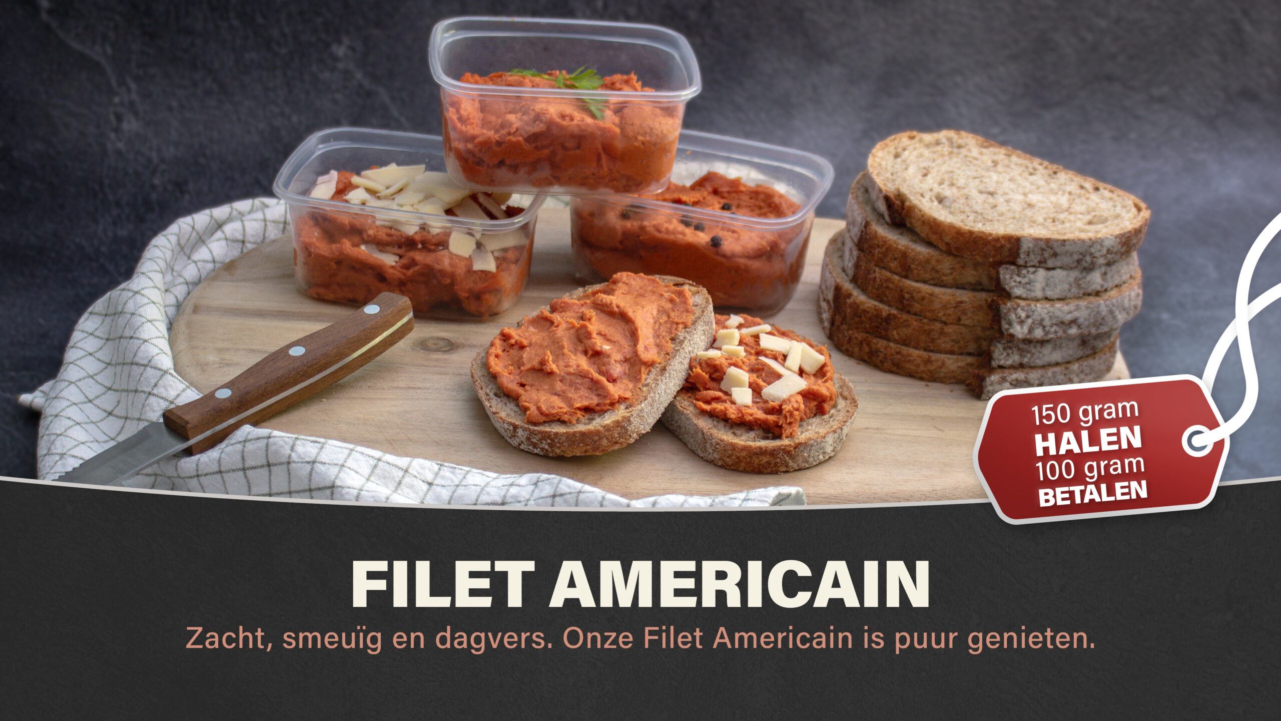 Zacht, smeuïg en dagvers. Onze Filet Americain is Puur genieten. 150 gram halen 100 gram betalen.