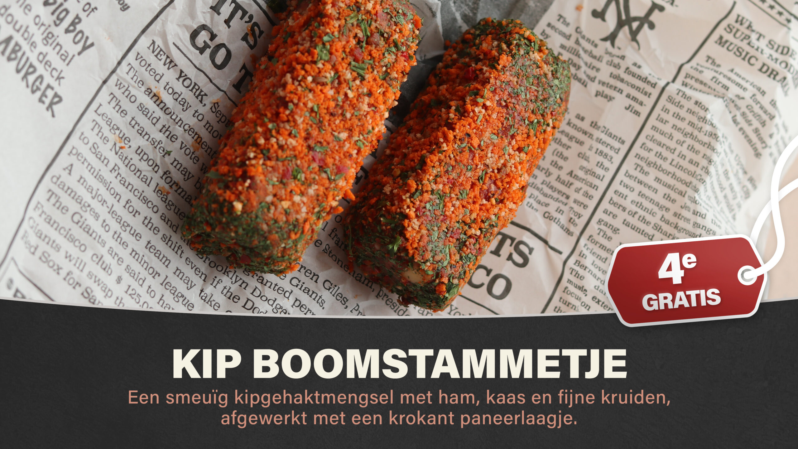 Een smeuïg kipgehaktmengsel met ham, kaas en fijne kruiden, afgewerkt met een krokant paneerlaagje. Elke 4e gratis.