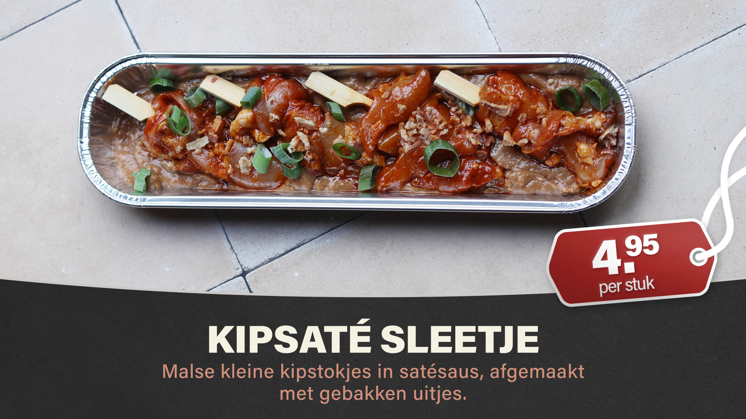 Malse kleine kipstokjes in satésaus, afgemaakt met gebakken uitjes.