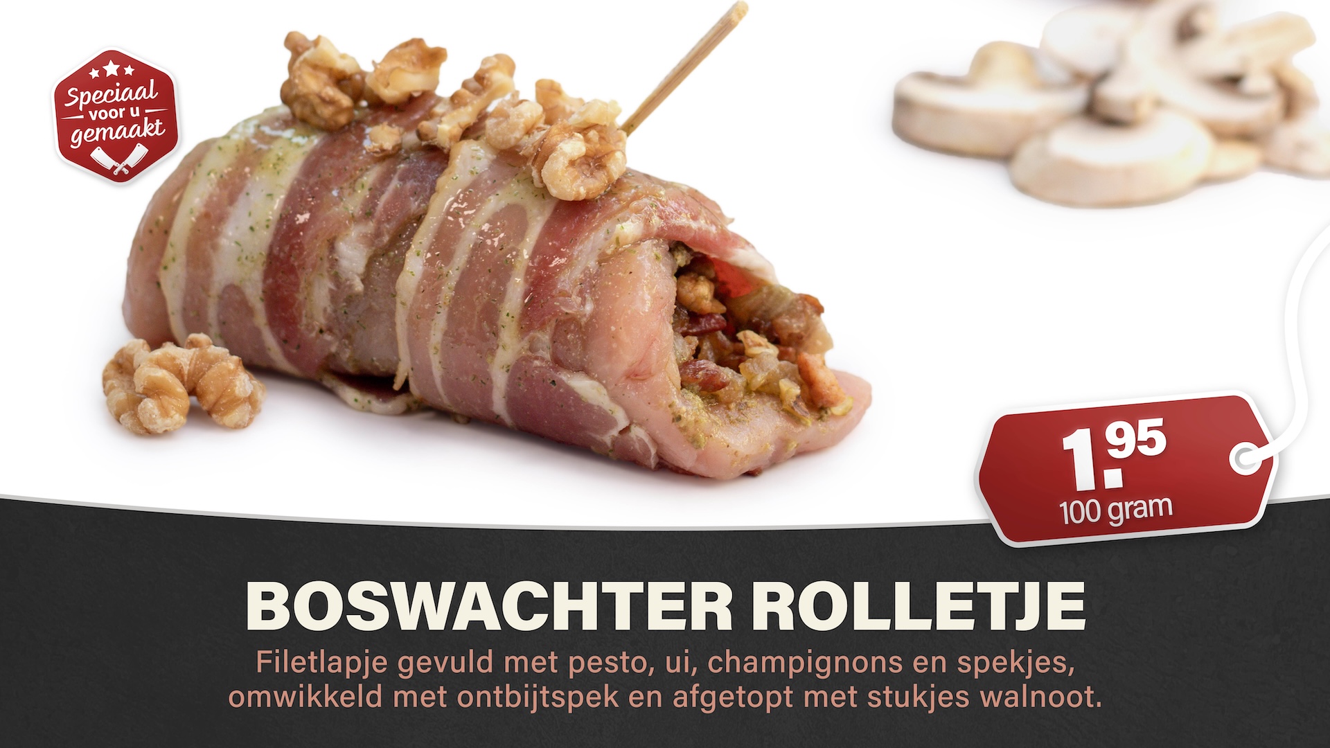 Filetlapje gevuld met pesto, ui, champignons en spekjes, omwikkeld met ontbijtspek en afgetopt met stukjes walnoot.